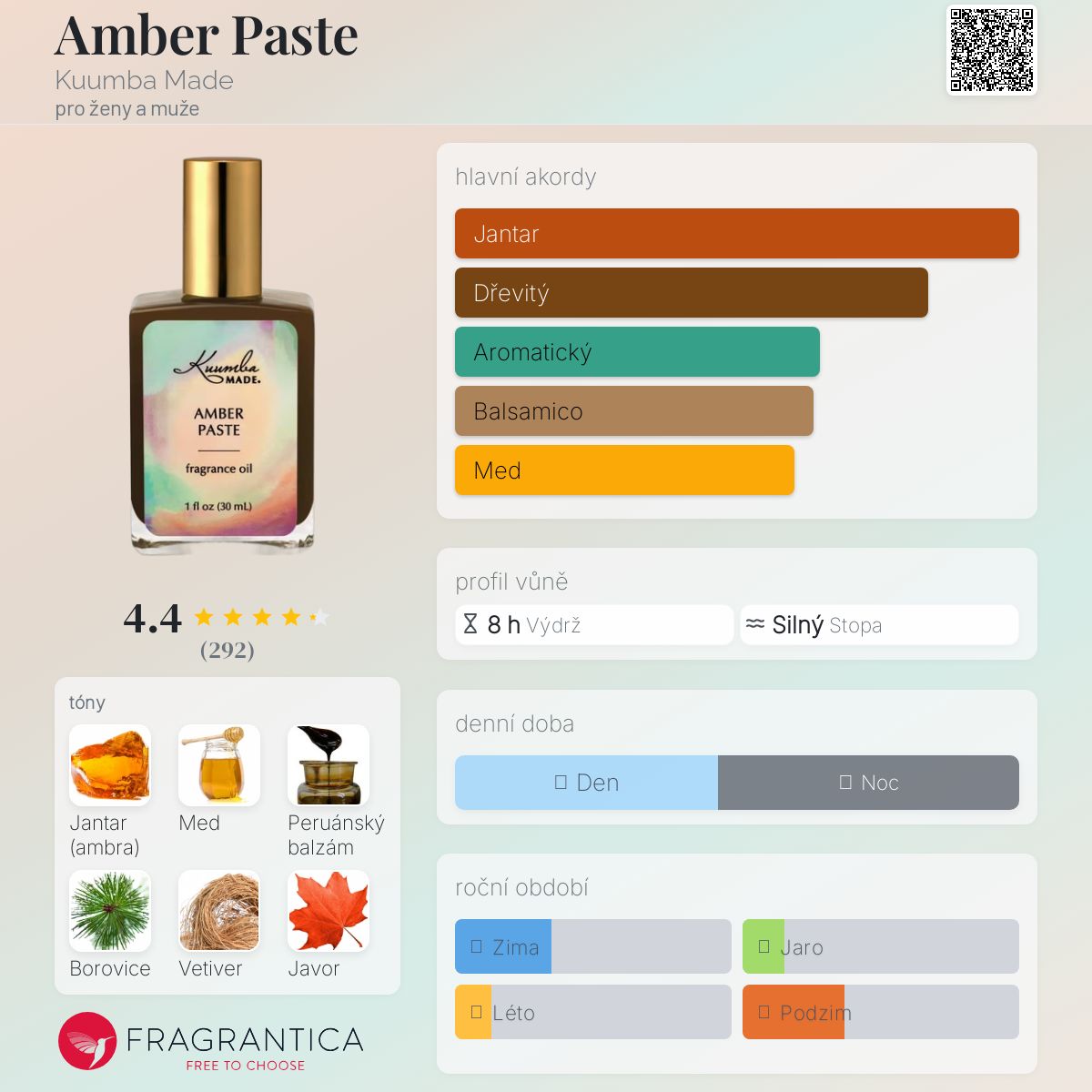 Amber Paste podle Kuumba Made je Orientální Spicy vůně pro ženy a muže. Vrchní tóny jsou Med, Bergamot, Muškátový oříšek a Limetka; střední tóny jsouBorovice, Javor a Pelargónie ; základní tóny jsou Jantar (ambra), Peruánský balzám a Vetiver.