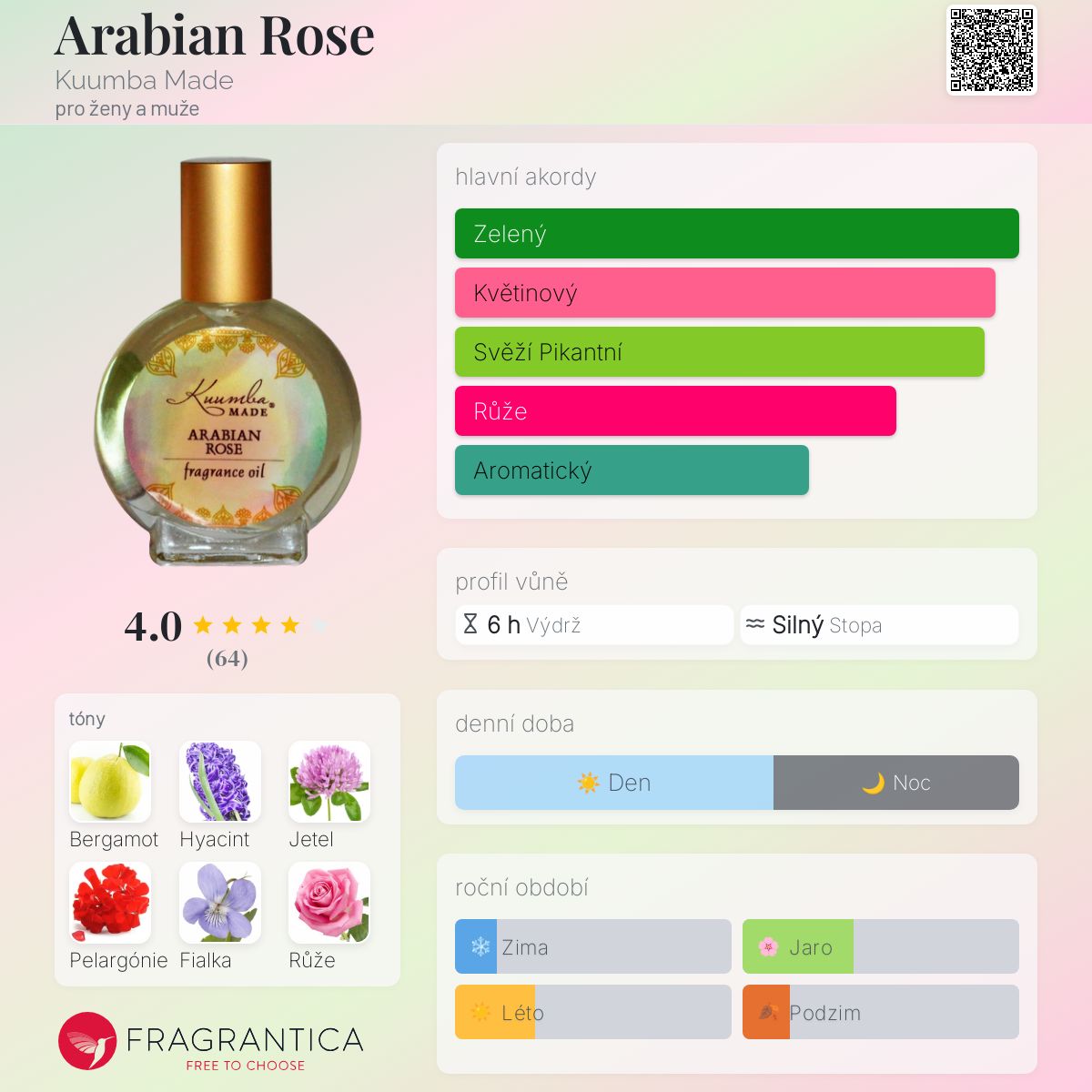 Arabian Rose podle Kuumba Made je Floral vůně pro ženy a muže. Vrchní tóny jsou Bergamot, Hyacint a Jetel; střední tóny jsouPelargónie, Fialka, Růže a Ozonové tóny ; základní tóny jsou Konvalinka a Seno.
