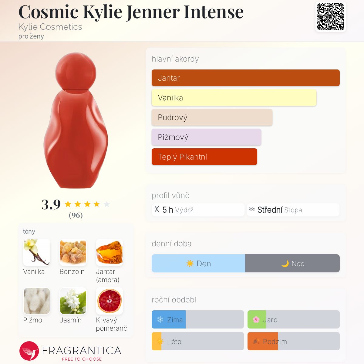 Cosmic Kylie Jenner Intense podle Kylie Cosmetics je Orientální Vanilla vůně pro ženy. Toto je nová vůně. Cosmic Kylie Jenner Intense byl/a uveden/a v roce 2026. Vrchní tóny jsou Jasmín mnohokvětý a Krvavý pomeranč; střední tóny jsouBenzoin a Jantar (ambra) ; základní tóny jsou Vanilka a Pižmo.