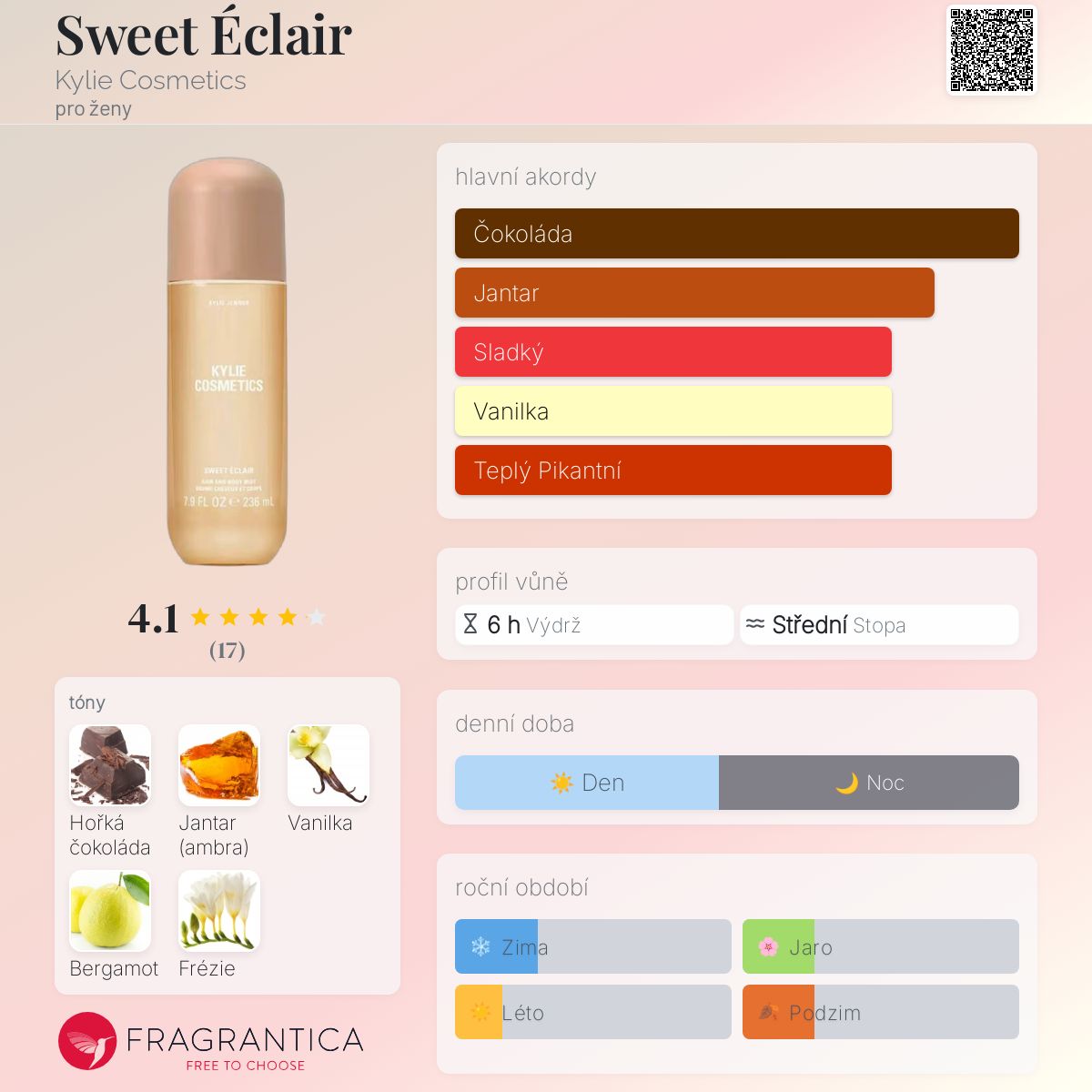 Sweet Éclair podle Kylie Cosmetics je Orientální Woody vůně pro ženy. Toto je nová vůně. Sweet Éclair byl/a uveden/a v roce 2025. Vrchní tón je Bergamot ; střední tóny jsouČokoláda a Okvětní lístky frézie ; základní tóny jsou Jantar (ambra) a Vanilka.