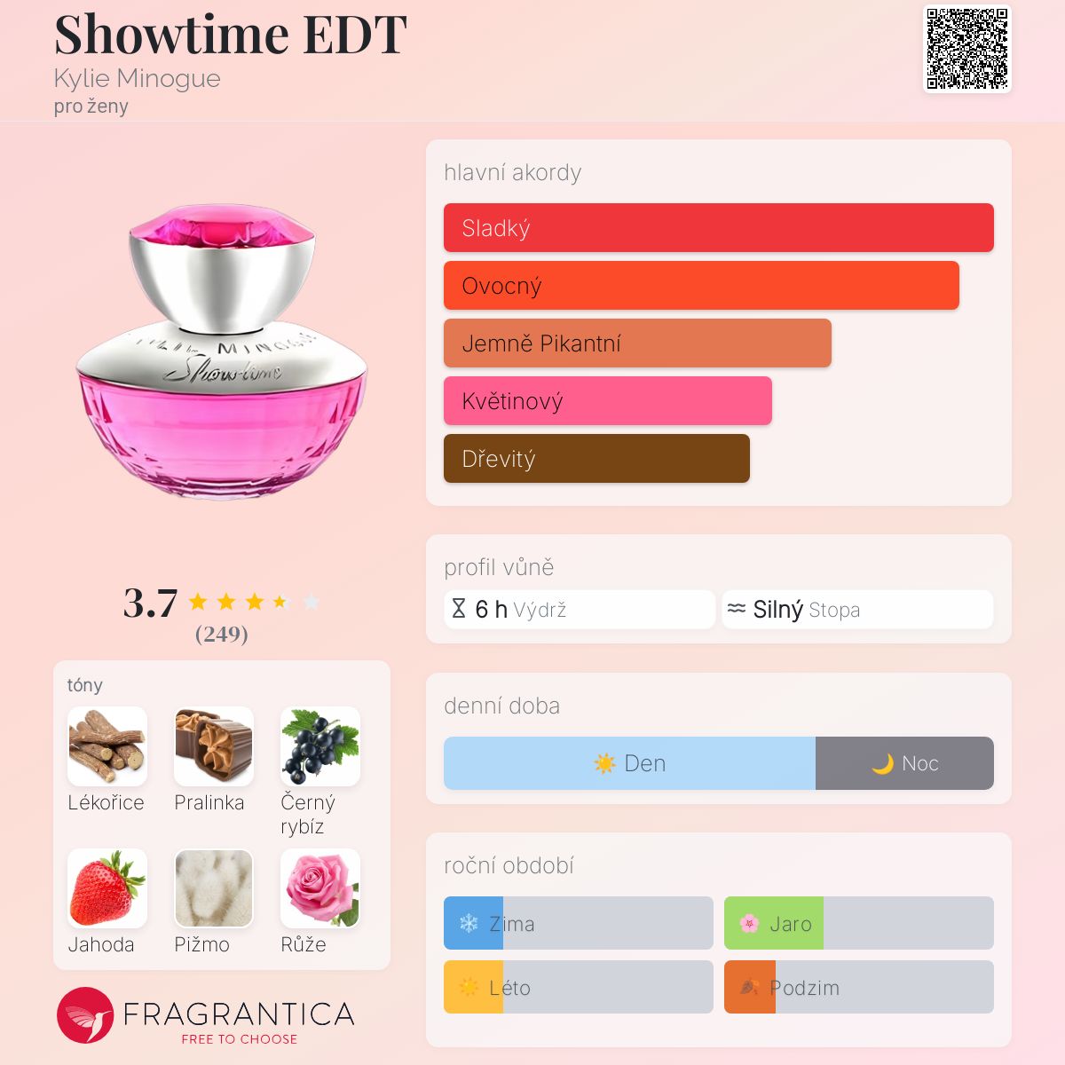 Showtime EDT podle Kylie Minogue je Floral Fruity Gourmand vůně pro ženy. Showtime EDT byl/a uveden/a v roce 2008. "Nosem" za touto vůní je Vincent Schaller. Vrchní tóny jsou Černý rybíz a Jahoda; střední tóny jsouLékořice, Růže, Šeřík, Frézie a Květ tiare ; základní tóny jsou Pralinka, Bílé pižmo a Brazilské růžové dřevo.