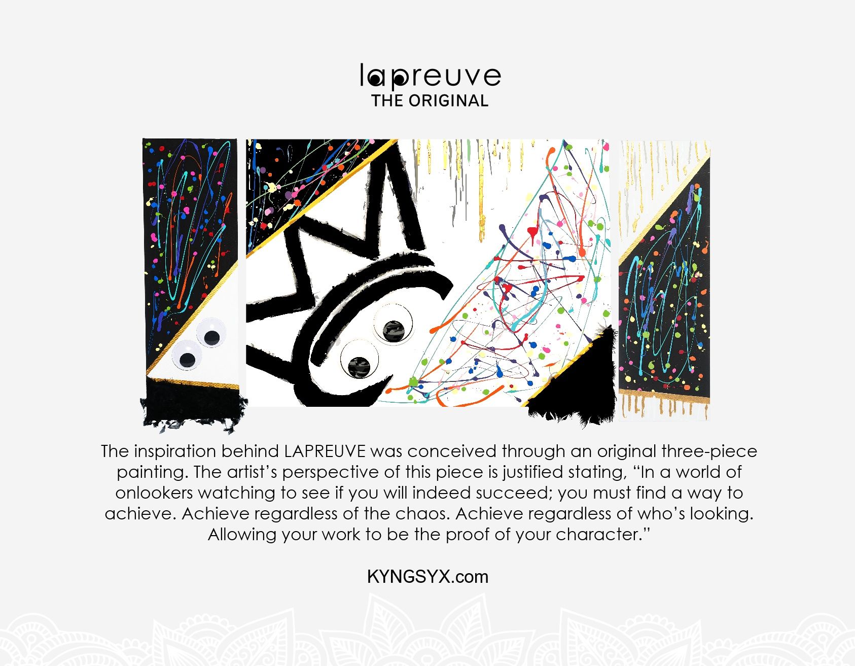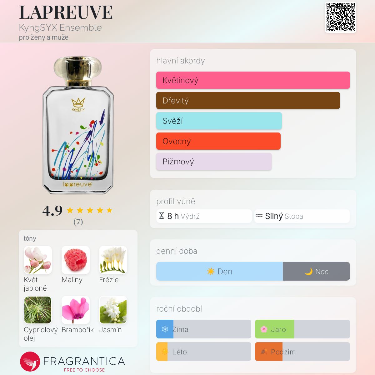 LAPREUVE podle KyngSYX Ensemble je Floral Woody Musk vůně pro ženy a muže. LAPREUVE byl/a uveden/a v roce 2023. "Nosem" za touto vůní je François Damide. Vrchní tóny jsou Květ jabloně , Maliny, Frézie a Cypriolový olej; střední tóny jsouBrambořík, Jasmín a Pivoňka ; základní tóny jsou Kašmírové dřevo, Atlasový cedr, Santalové dřevo, Pačuli, Pižmo a Ambra.