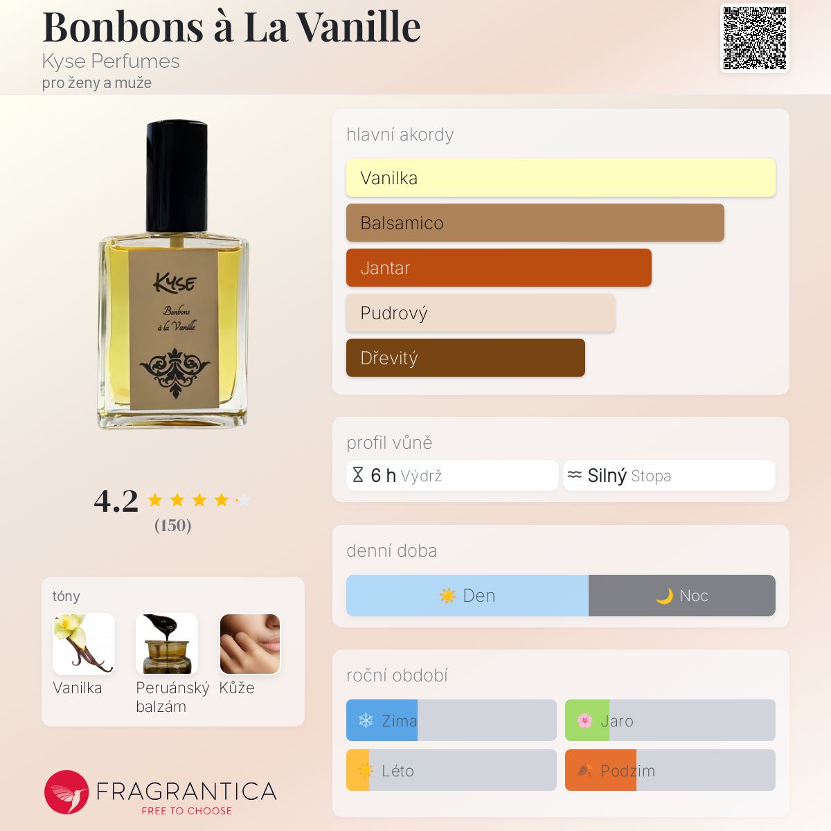 Bonbons à La Vanille podle Kyse Perfumes je vůně pro ženy a muže. Bonbons à La Vanille byl/a uveden/a v roce 2018. "Nosem" za touto vůní je Terri Bozzo.