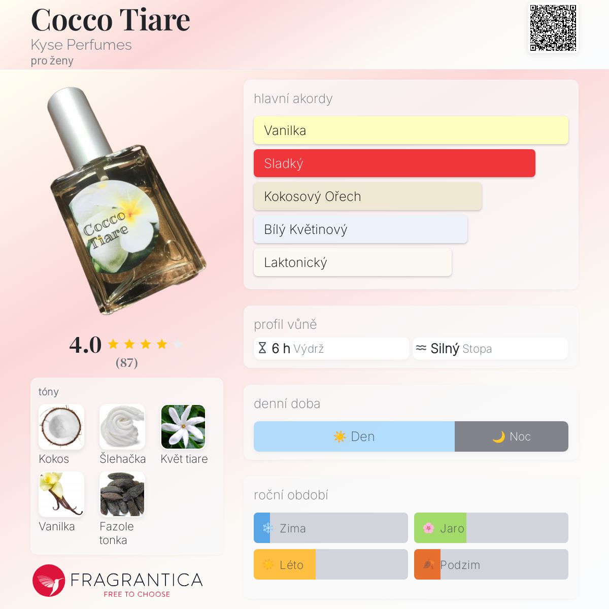 Cocco Tiare podle Kyse Perfumes je vůně pro ženy. Cocco Tiare byl/a uveden/a v roce 2019. "Nosem" za touto vůní je Terri Bozzo.