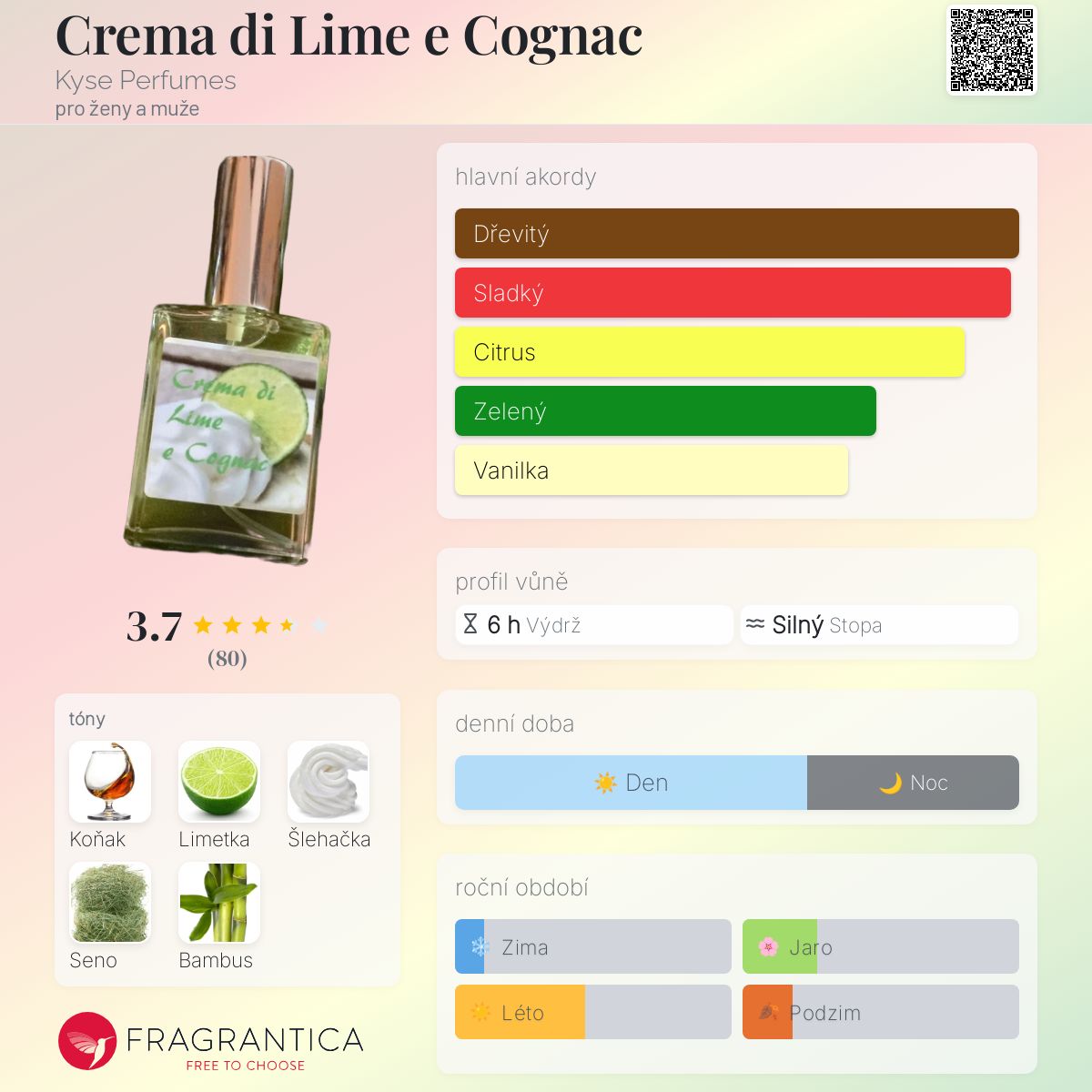 Crema di Lime e Cognac podle Kyse Perfumes je Citrus Gourmand vůně pro ženy a muže. Crema di Lime e Cognac byl/a uveden/a v roce 2016. "Nosem" za touto vůní je Terri Bozzo.