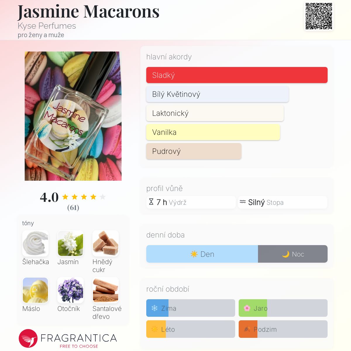 Jasmine Macarons podle Kyse Perfumes je Floral Fruity Gourmand vůně pro ženy a muže. Jasmine Macarons byl/a uveden/a v roce 2020. "Nosem" za touto vůní je Terri Bozzo.