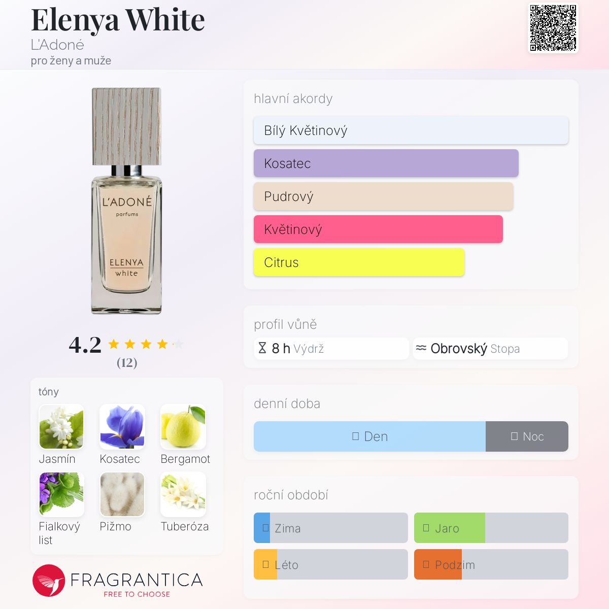 Elenya White podle L'Adoné je Orientální Floral vůně pro ženy a muže. Elenya White byl/a uveden/a v roce 2018. "Nosem" za touto vůní je Andreas Wilhelm. Vrchní tóny jsou Jasmín Sambac, Kosatec, Bergamot a Tuberóza; střední tóny jsouFialkový list, Broskvový květ, Siamský (thajský) benzoin a Pačuli ; základní tóny jsou Přírodní pižmo, Okvětní lístky růží, Santalové dřevo a Vistárie.
