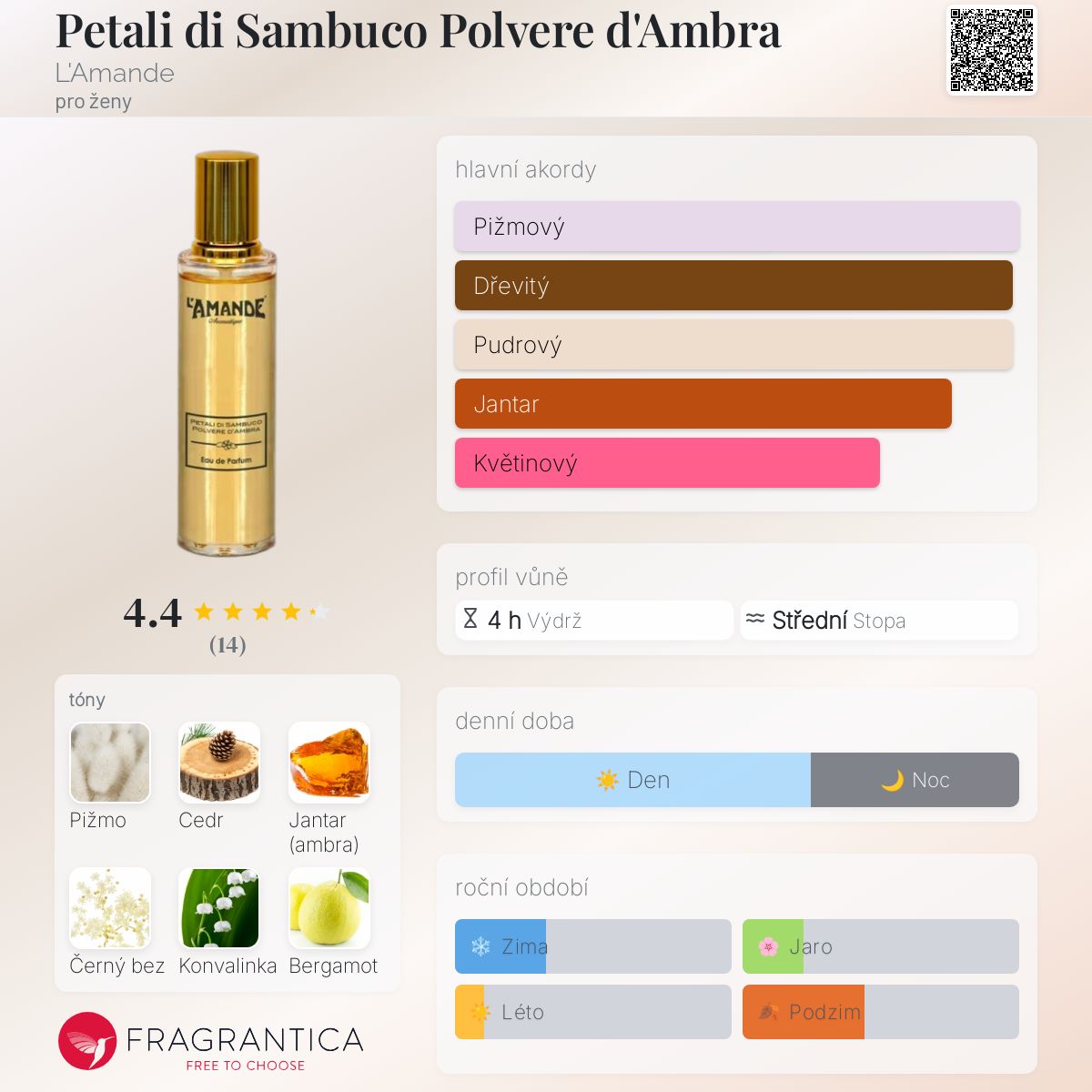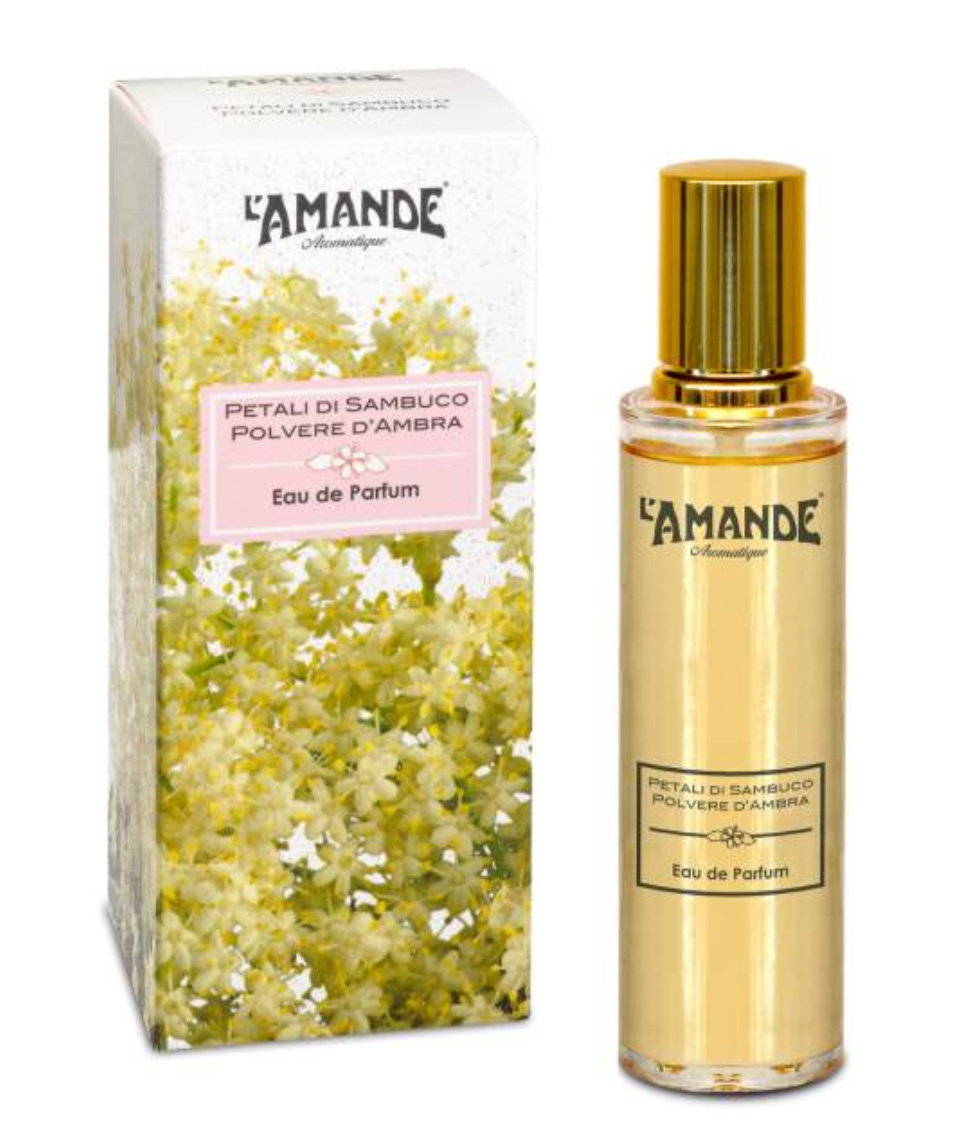 Petali di Sambuco Polvere d'Ambra podle L'Amande je vůně pro ženy. Vrchní tón je Kalábrijský bergamot ; střední tóny jsouČerný bez, Konvalinka, Růže a Kosatec ; základní tóny jsou Bílé pižmo, Cedr, Jantar (ambra), Pačuli a Vanilka.
