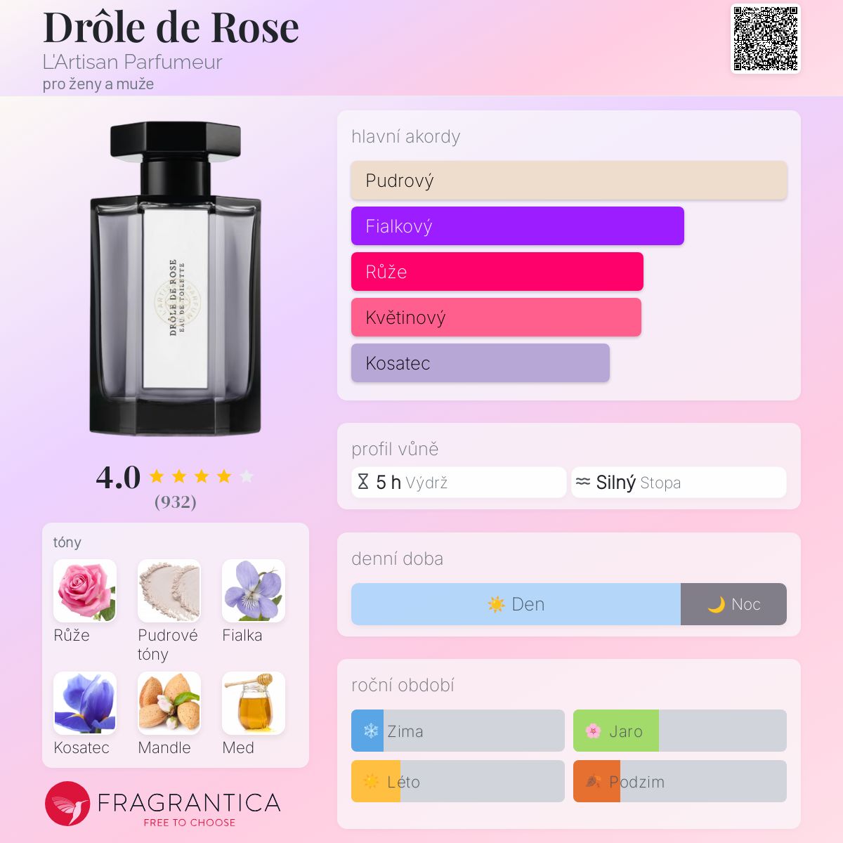 Drôle de Rose podle L'Artisan Parfumeur je Floral vůně pro ženy a muže. Drôle de Rose byl/a uveden/a v roce 1996. "Nosem" za touto vůní je Olivia Giacobetti. Vrchní tóny jsou Badyán a Květ afrického pomeranče; střední tóny jsouRůže, Pudrové tóny, Fialka a Kosatec ; základní tóny jsou Mandle, Bílý med a Kůže.