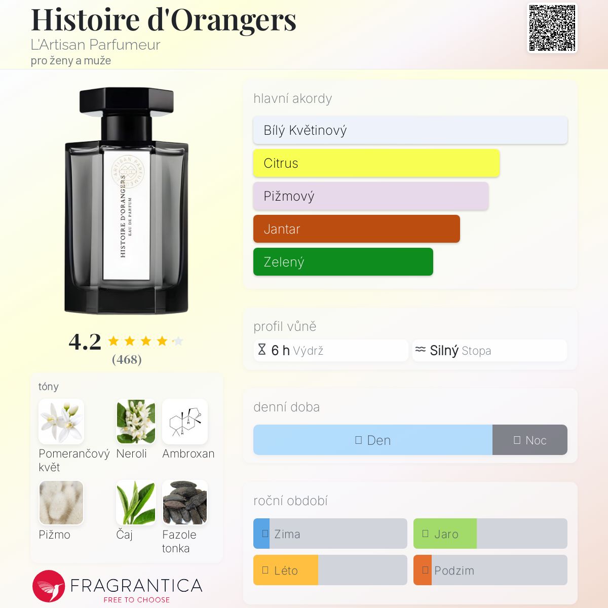 Histoire d'Orangers podle L'Artisan Parfumeur je Orientální Floral vůně pro ženy a muže. Histoire d'Orangers byl/a uveden/a v roce 2017. "Nosem" za touto vůní je Marie Salamagne. Vrchní tóny jsou Neroli a Bílý čaj; střední tóny jsouPomerančový květ a Pižmo ; základní tóny jsou Ambroxan a Fazole tonka.