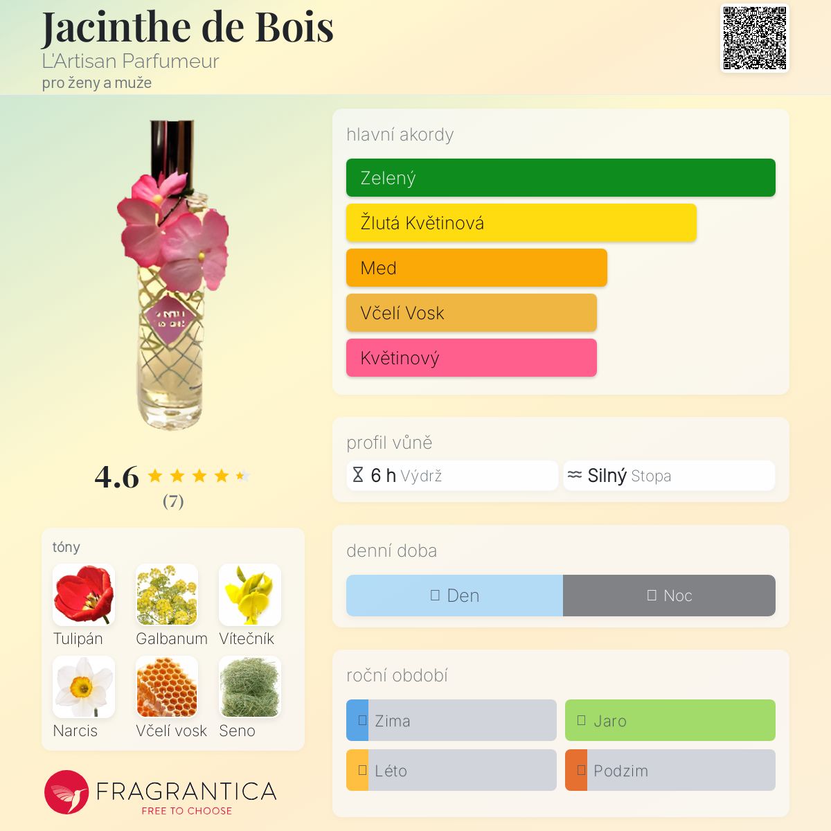 Jacinthe de Bois podle L'Artisan Parfumeur je Floral vůně pro ženy a muže. Jacinthe de Bois byl/a uveden/a v roce 2000. "Nosem" za touto vůní je Anne Flipo. Vrchní tóny jsou Tulipán a Galbanum; střední tóny jsouJanovec a Narcis ; základní tóny jsou Včelí vosk a Seno.