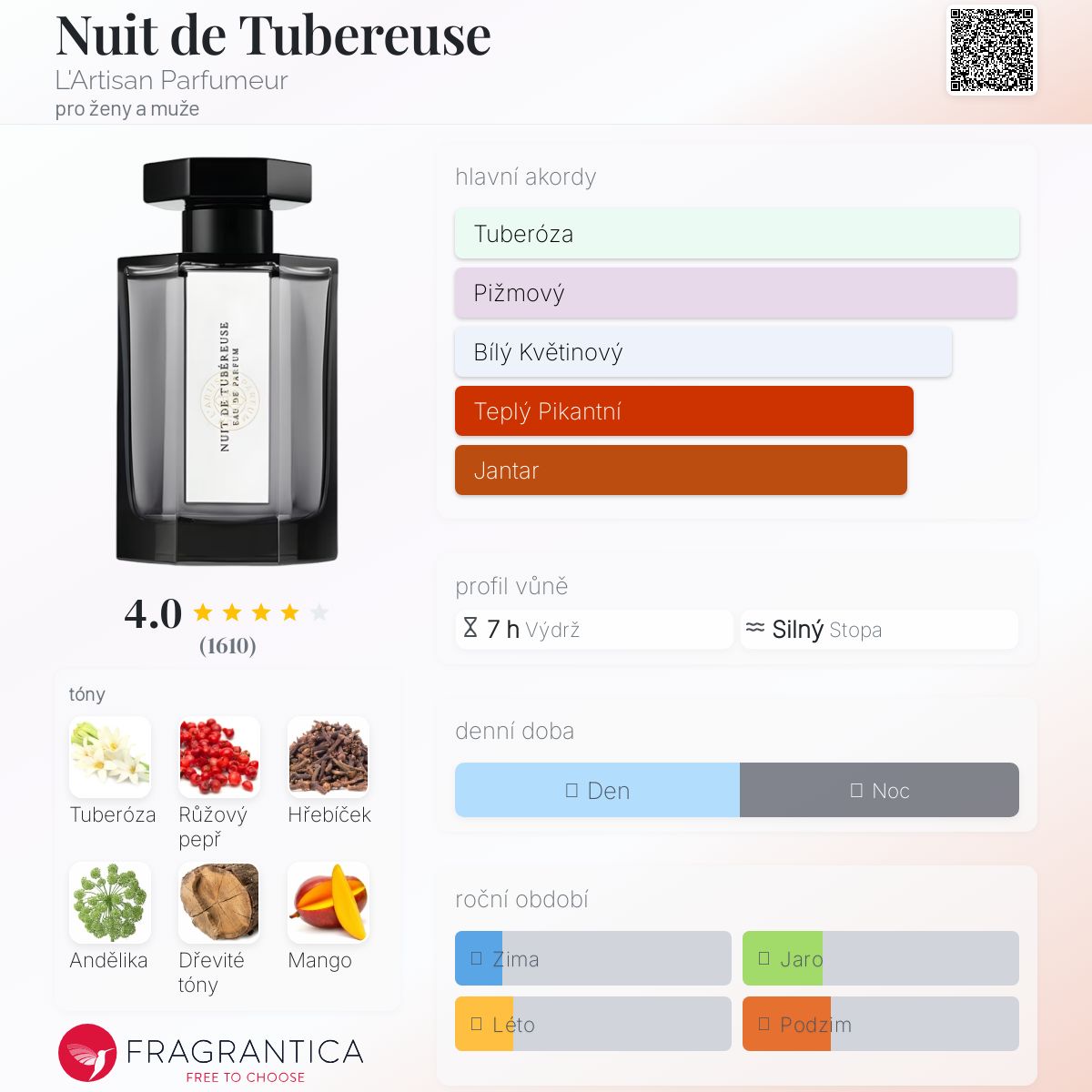 Nuit de Tubereuse podle L'Artisan Parfumeur je vůně pro ženy a muže. Nuit de Tubereuse byl/a uveden/a v roce 2010. "Nosem" za touto vůní je Bertrand Duchaufour. Vrchní tóny jsou Růžový pepř, Hřebíček a Mandarinka; střední tóny jsouTuberóza, Mango, Ylang-Ylang a Růže ; základní tóny jsou Andělika, Vzácné dřevo, Pryskyřice a Pižmo.