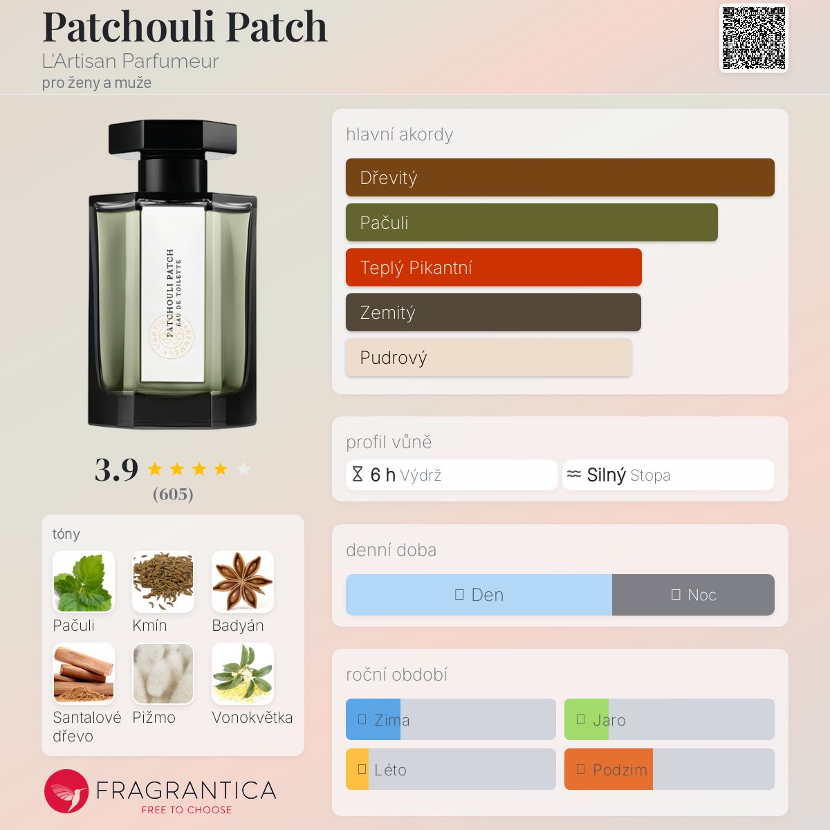Patchouli Patch podle L'Artisan Parfumeur je Orientální vůně pro ženy a muže. Patchouli Patch byl/a uveden/a v roce 2002. Patchouli Patch byl/a vytvořen/a Evelyne Boulanger a Bertrand Duchaufour. Vrchní tóny jsou Pačuli, Kmín, Badyán a Bílé pižmo; střední tóny jsouPačuli, Bílé pižmo, Vonokvětka a Kosatec ; základní tóny jsou Santalové dřevo, Vetiver a Cedr.
