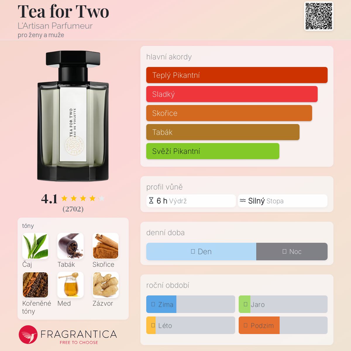 Tea for Two podle L'Artisan Parfumeur je Aromatic Spicy vůně pro ženy a muže. Tea for Two byl/a uveden/a v roce 2000. "Nosem" za touto vůní je Olivia Giacobetti. Vrchní tóny jsou Čaj, Badyán a Bergamot; střední tóny jsouSkořice, Koření, Zázvor a Perník ; základní tóny jsou Tabák, Med, Kůže a Vanilka.