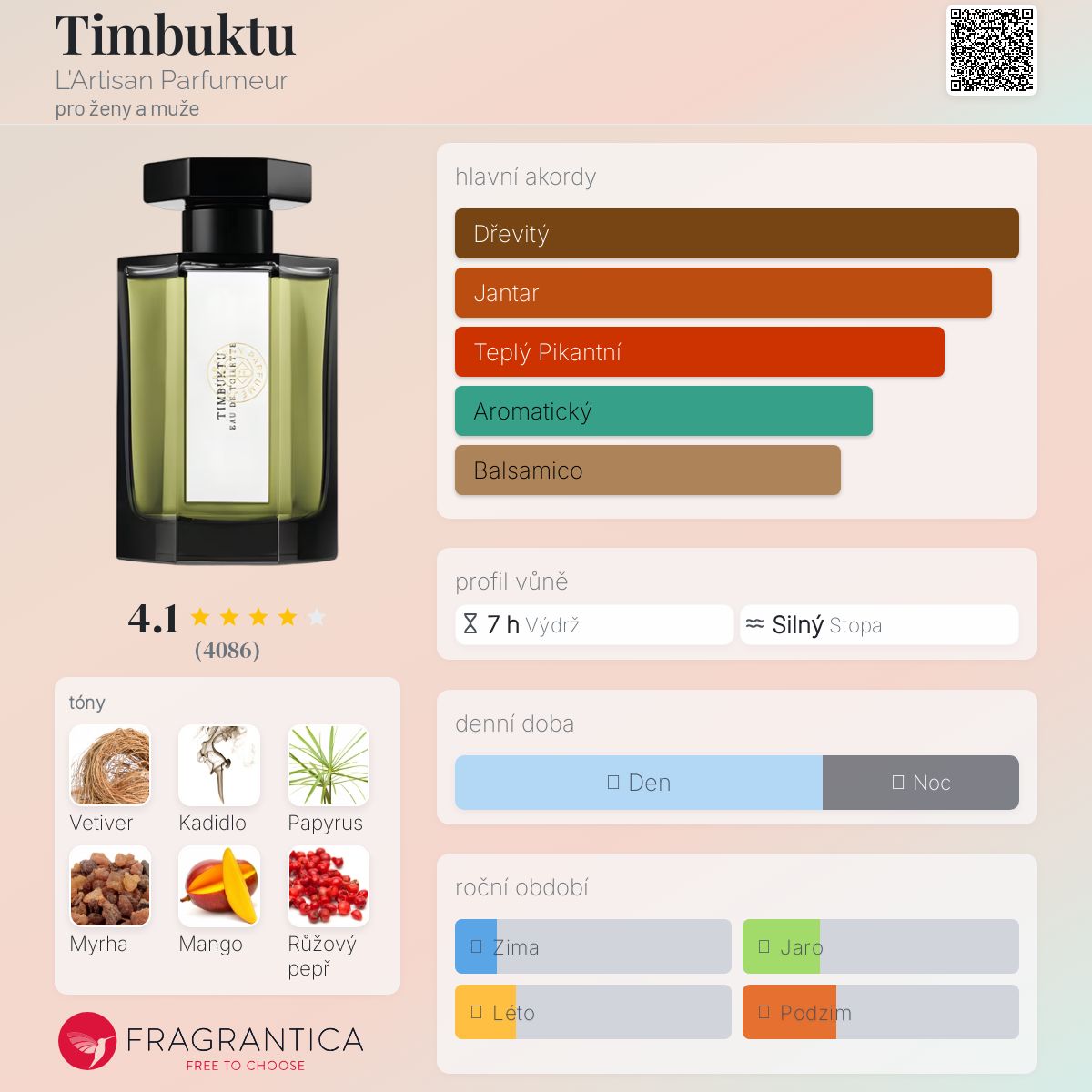 Duchaufour v jedné ze svých nejlepších podob. Ani nevím, jestli je to chypre, nebo ne. Pro mě je to jedna z nejúžasnějších směsí kadidla a červeného pepře. Je tak komplexně vytvořená, že jsem tomu nemohla uvěřit, když jsem viděla pyramidu. Zřetelně v ní slyším jakési ovocně-citrusové obsazení. Ale mango? No, tak to nezní, tak jak může být slyšet papyrus, ale to bych do něj neřekla. A vetiver je tu tak zvláštní, odchází do pozadí, že mě velmi překvapují hlasy, které ho zařadily na první místo. Podle mě je to vůně o kadidle a pepři. A vznikla v době, kdy se ještě nestala současným mainstreamem pro mnoho niche značek. Možná se zde dá hodit most do minulosti Duchaufoura z Comme des Garcons, protože při studiu ostatních Bertrandových děl neměl až dosud takový rukopis. A v Garçons si vytvořil jen obrys svého stylu a teprve v L`Artisan ho dokázal realizovat. A Timbuktu je základním kamenem jeho kariéry. Myslím, že bude vždy patřit do top 10 nebo dokonce top 5 vůní jeho kariéry. A stále, navzdory popularitě tónů, neexistuje podobná obdoba.