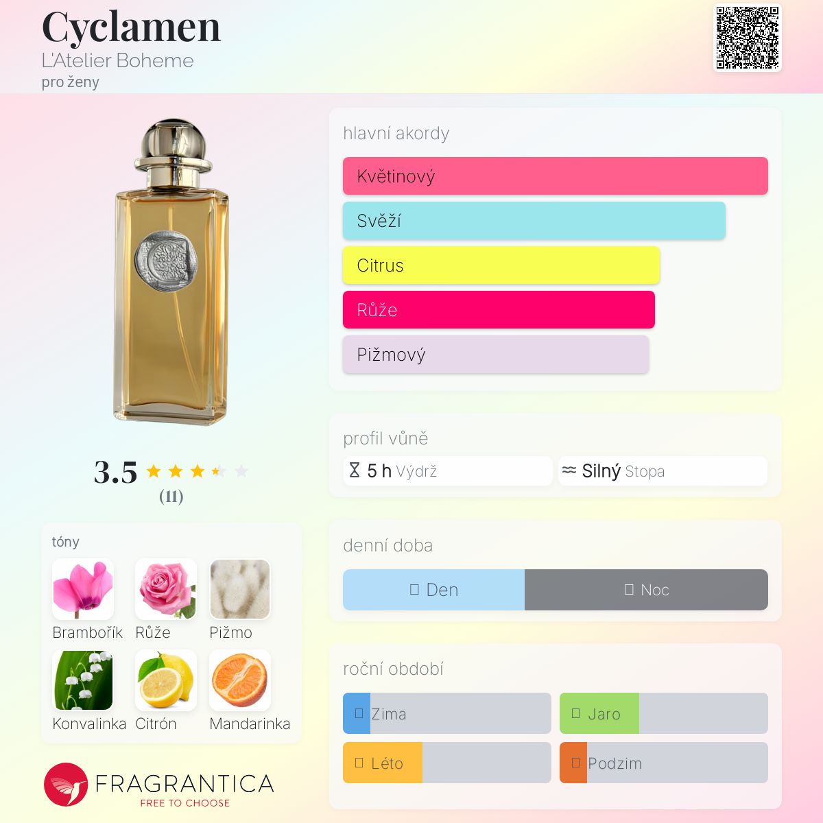Cyclamen podle L'Atelier Boheme je Floral vůně pro ženy. Cyclamen byl/a uveden/a v roce 2009. "Nosem" za touto vůní je Crystelle Darchicourt. Vrchní tóny jsou Citron amalfi a Mandarinka; střední tóny jsouBrambořík, Růže a Konvalinka ; základní tón je Pižmo.