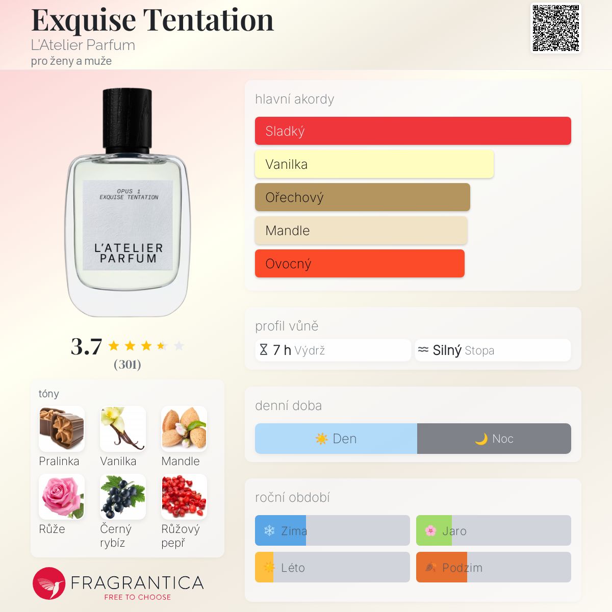 Exquise Tentation podle L'Atelier Parfum je Floral Fruity Gourmand vůně pro ženy a muže. Exquise Tentation byl/a uveden/a v roce 2021. "Nosem" za touto vůní je Dorothée Piot. Vrchní tóny jsou Černý rybíz, Růžový pepř a Bergamot; střední tóny jsouRůže, Kosatec, Frézie a Konvalinka ; základní tóny jsou Pralinka, Vanilka, Hořká mandle, Pačuli a Pižmo.