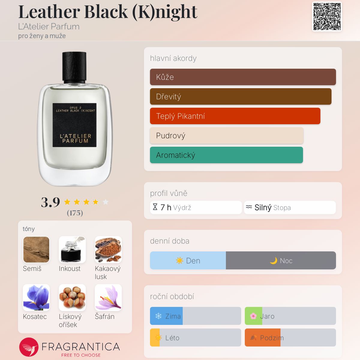 Leather Black (K)night podle L'Atelier Parfum je vůně pro ženy a muže. Leather Black (K)night byl/a uveden/a v roce 2022. "Nosem" za touto vůní je Serge de Oliveira. Vrchní tóny jsou Šafrán, Růžový pepř a Bergamot; střední tóny jsouInkoust, Kakao, Kosatec a Jasmín Sambac ; základní tóny jsou Semiš, Lískový oříšek a Pačuli.