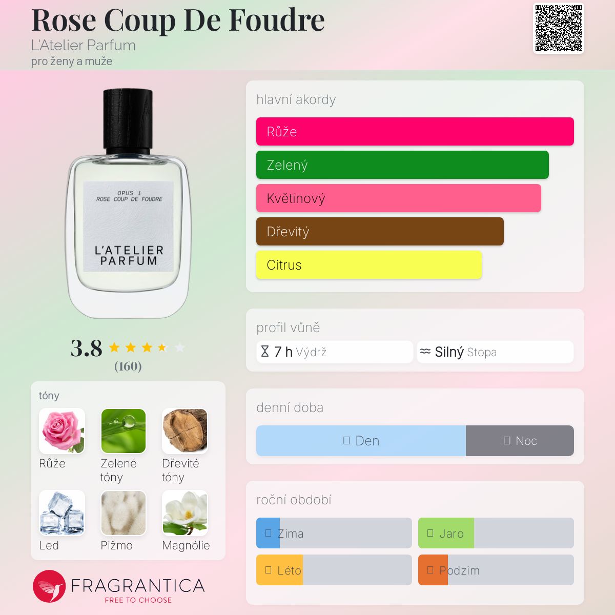 Rose Coup De Foudre podle L'Atelier Parfum je Floral vůně pro ženy a muže. Rose Coup De Foudre byl/a uveden/a v roce 2021. "Nosem" za touto vůní je Sidonie Lancesseur. Vrchní tóny jsou Zelené tóny, Černý rybíz a Bergamot; střední tóny jsouRůže, Led a Magnólie ; základní tóny jsou Dřevité tóny, Pižmo a Jantar (ambra).