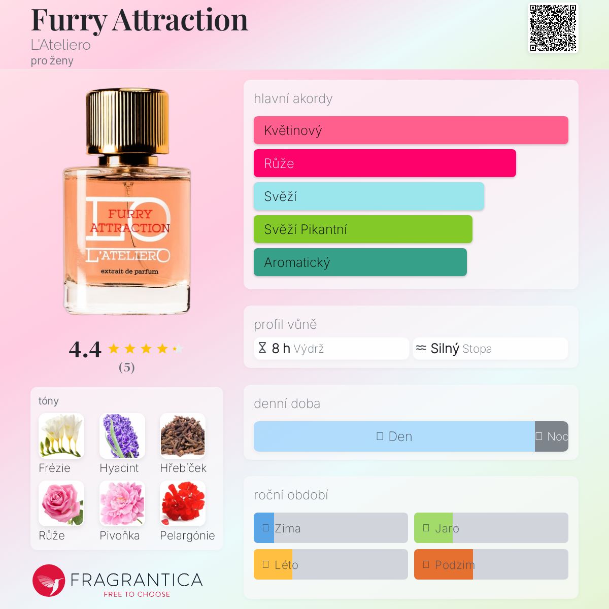 Furry Attraction podle L'Ateliero je Floral vůně pro ženy. Furry Attraction byl/a uveden/a v roce 2020. "Nosem" za touto vůní je Rudi Gabriel Bedy. Vrchní tóny jsou Frézie, Hyacint a Hřebíček; střední tóny jsouRůže, Pivoňka a Pelargónie ; základní tóny jsou Liči, Konvalinka a Vetiver.