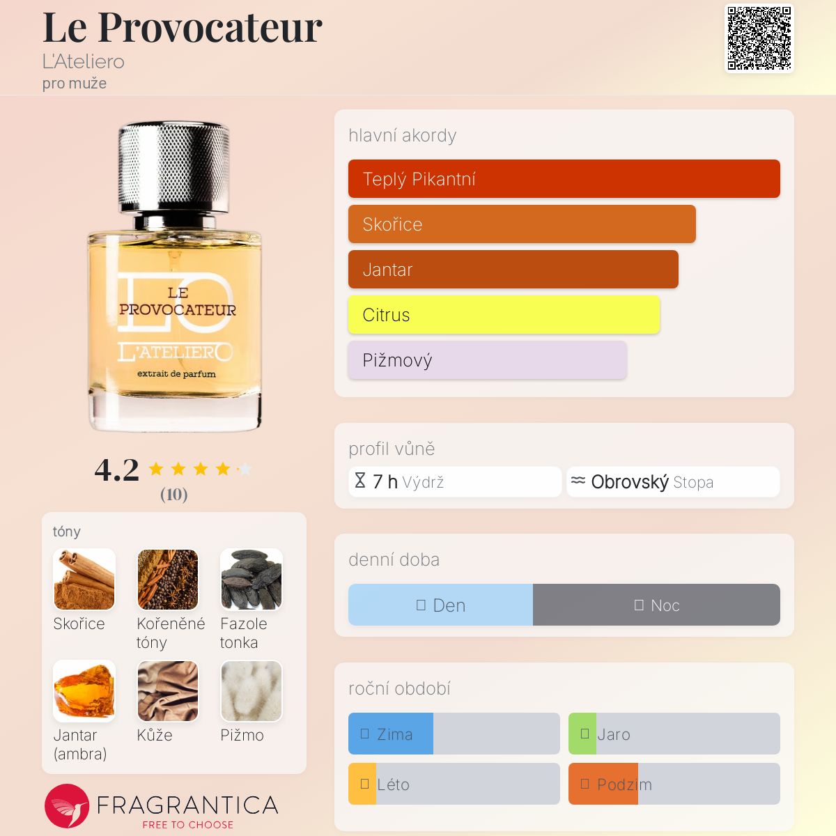 Le Provocateur podle L'Ateliero je Leather vůně pro muže. Le Provocateur byl/a uveden/a v roce 2020. "Nosem" za touto vůní je Rudi Gabriel Bedy. Vrchní tóny jsou Skořice, Fazole tonka a Růže; střední tóny jsouJantar (ambra), Mandarinka a Grapefruit ; základní tóny jsou Koření, Kůže a Pižmo.