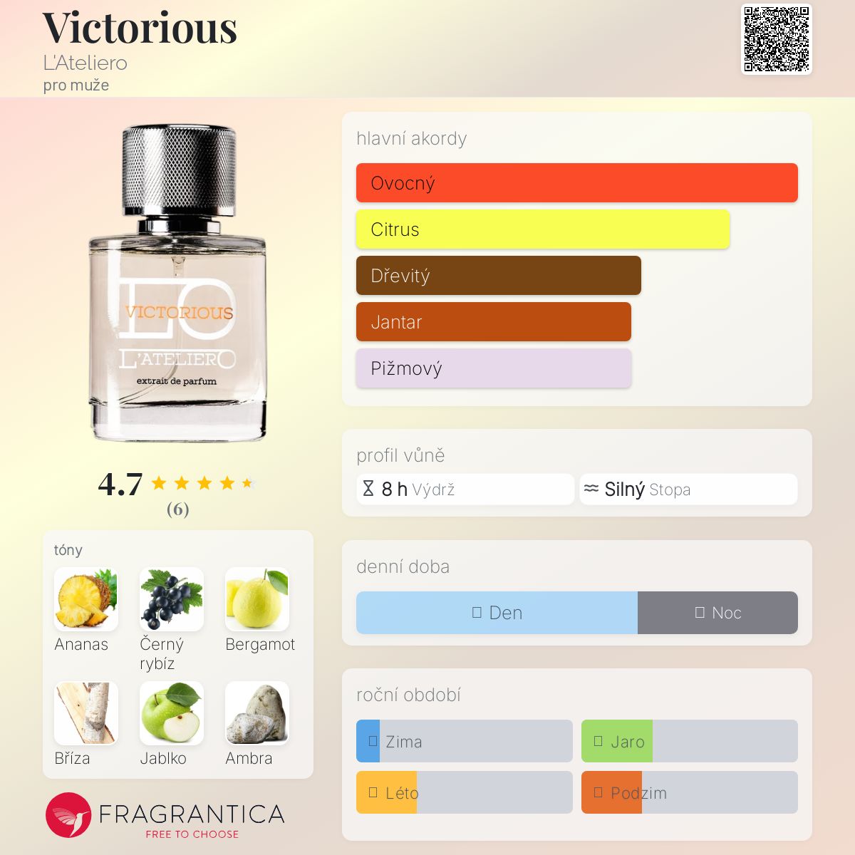 Victorious podle L'Ateliero je Woody Aromatic vůně pro muže. Victorious byl/a uveden/a v roce 2020. "Nosem" za touto vůní je Rudi Gabriel Bedy. Vrchní tóny jsou Ananas, Černý rybíz a Bergamot; střední tóny jsouBříza, Jablko a Ambra ; základní tóny jsou Pižmo, Dubový mech a Citrón.