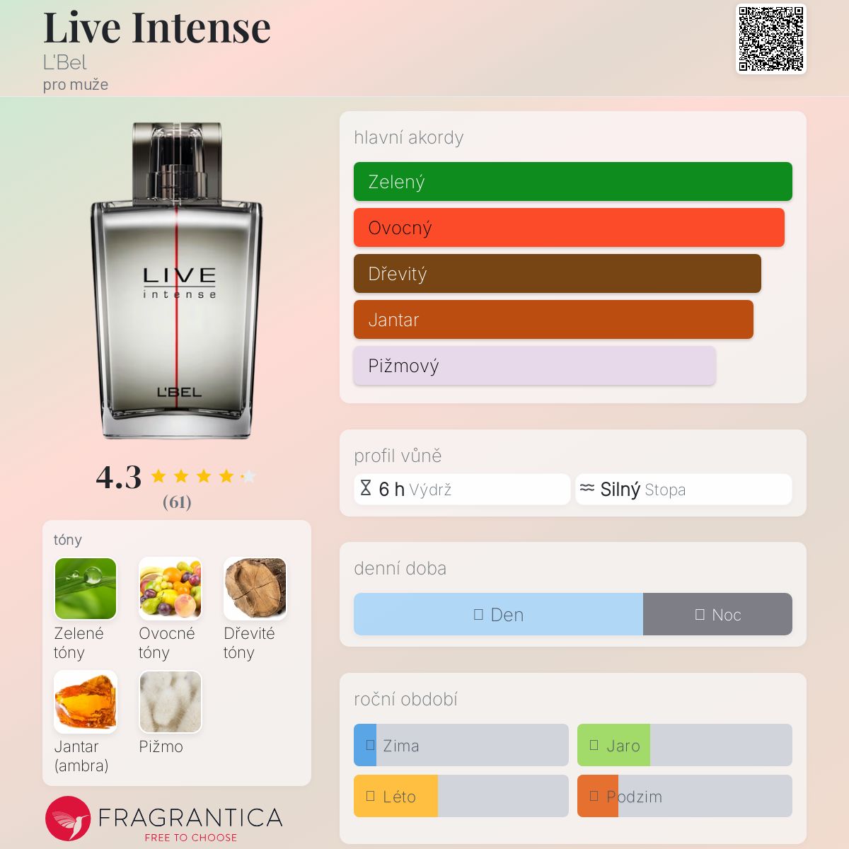 Live Intense podle L'Bel je vůně pro muže. Live Intense byl/a uveden/a v roce 2016. "Nosem" za touto vůní je Maurice Roucel. Vrchní tón je Zelené tóny ; střední tóny jsouOvocné tóny a Dřevité tóny ; základní tóny jsou Jantar (ambra) a Pižmo.