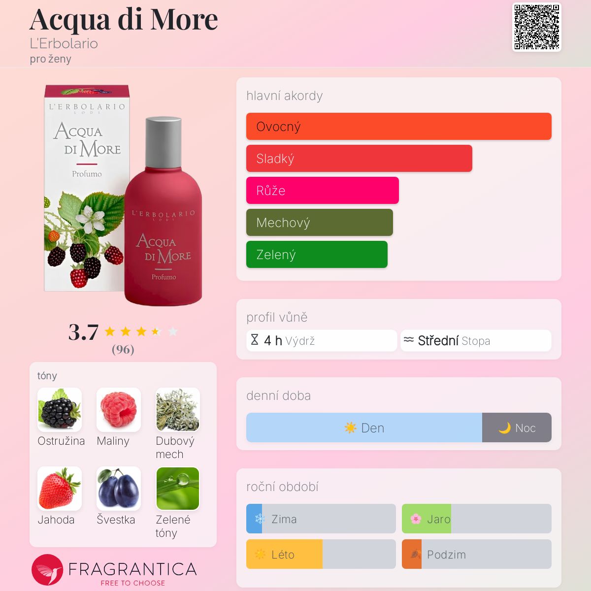 Acqua di More podle L'Erbolario je Aromatic Fruity vůně pro ženy. Acqua di More byl/a uveden/a v roce 2012. Vrchní tóny jsou Ostružina, Maliny, Jahoda, Švestka, Pomeranč, Broskev a Bergamot; střední tóny jsouZelené tóny, Jasmín, Konvalinka a Růže ; základní tóny jsou Dubový mech, Cedr a Santalové dřevo.