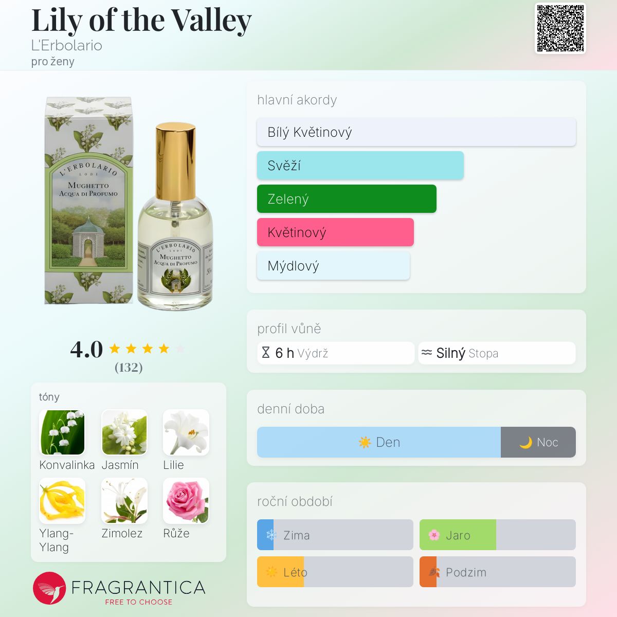 Lily of the Valley podle L'Erbolario je Floral Green vůně pro ženy. Vrchní tóny jsou Konvalinka, Lilie a Damašská růže; střední tóny jsouJasmín, Ylang-Ylang a Zimolez ; základní tóny jsou Santalové dřevo a Jantar (ambra).