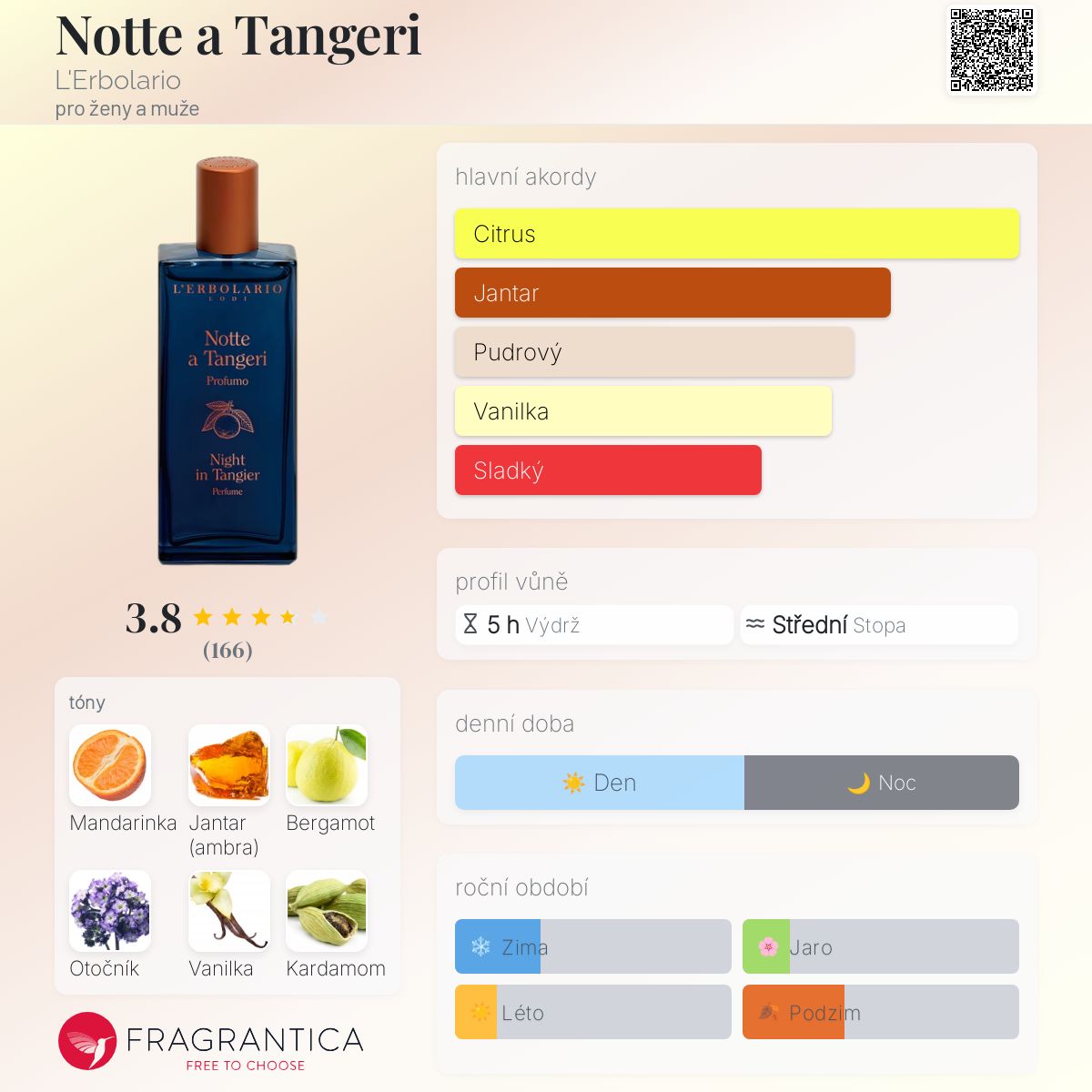 Notte a Tangeri podle L'Erbolario je Orientální vůně pro ženy a muže. Notte a Tangeri byl/a uveden/a v roce 2023. Vrchní tóny jsou Mandarinka, Bergamot a Kardamom; střední tóny jsouOtočník a Andělika ; základní tóny jsou Jantar (ambra) a Vanilka.