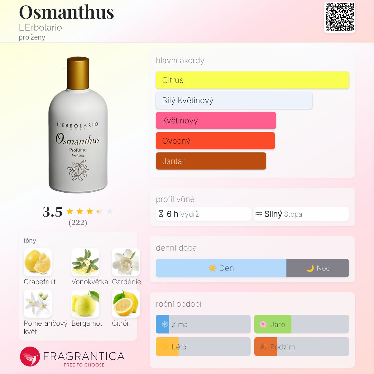 Osmanthus podle L'Erbolario je Floral vůně pro ženy. Osmanthus byl/a uveden/a v roce 2016. Vrchní tóny jsou Grapefruit, Bergamot, Sicilský citron, Meruňka, Růžový pepř a Žlutá mandarinka; střední tóny jsouVonokvětka, Gardénie, Pomerančový květ, Andělika, Jasmín a Turecká růže ; základní tóny jsou Pačuli, Amyris, Benzoin a Bourbonská vanilka.