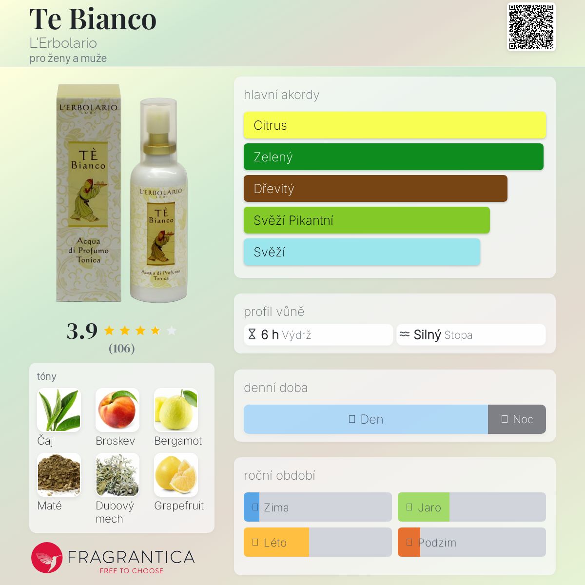 Te Bianco podle L'Erbolario je Aromatic vůně pro ženy a muže. Vrchní tóny jsou Bergamot, Grapefruit a Pomeranč; střední tóny jsouBílý čaj, Broskev, Jasmín, Jasmín Sambac, Růže a Jablko ; základní tóny jsou Maté, Mech, Cedr, Kumarin a Guajakové dřevo.