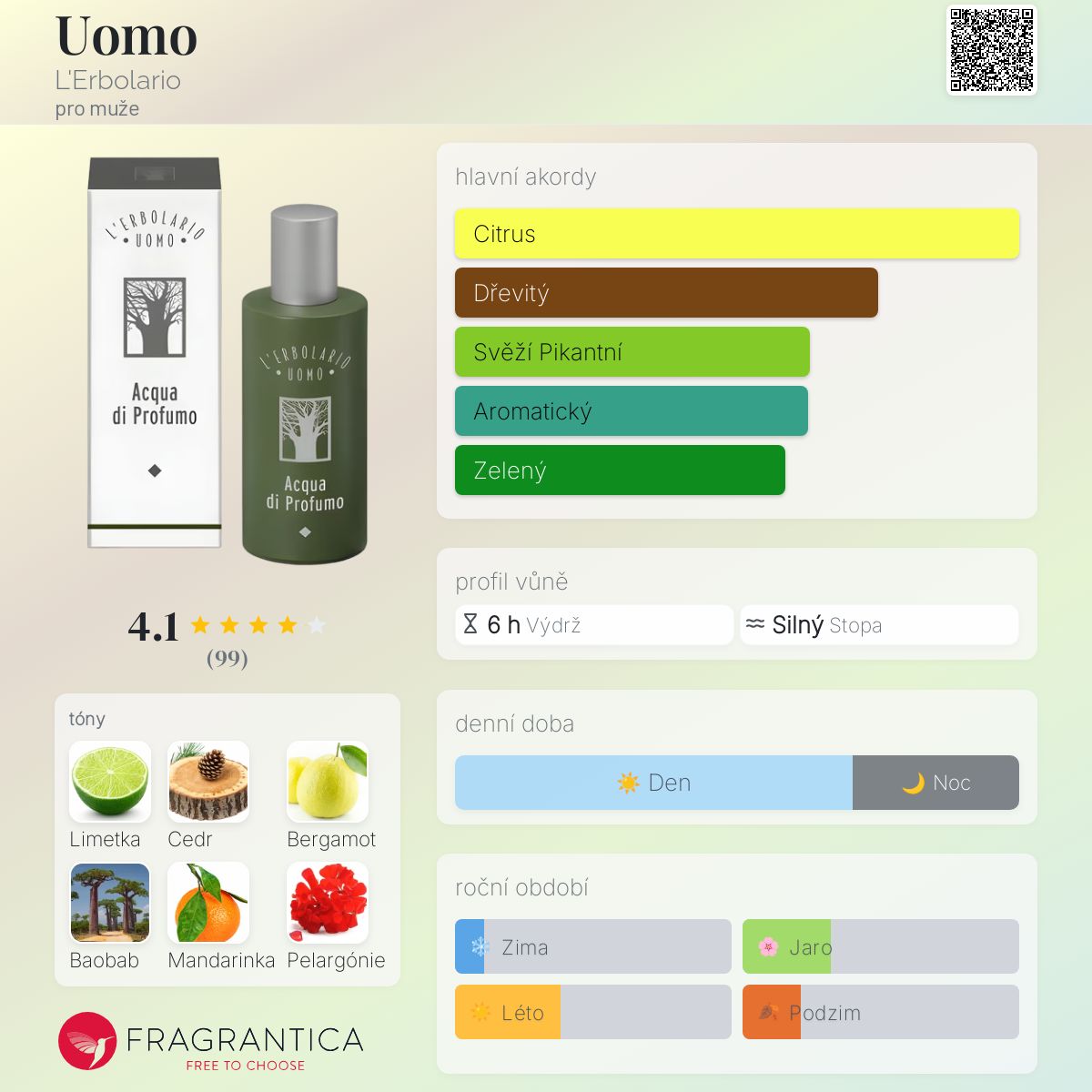 Uomo podle L'Erbolario je Woody Aromatic vůně pro muže. Uomo byl/a uveden/a v roce 2011. Vrchní tóny jsou Limetka, Bergamot, Baobab, Zelená mandarinka a Vodní ovoce; střední tóny jsouPelargónie, Červený rybíz, Galbanum, Červené řasy, Brambořík, Kosatec a Hřebíček ; základní tóny jsou Virginský cedr, Copahu balzám, Káva, Pižmo, Pačuli a Jantar (ambra).
