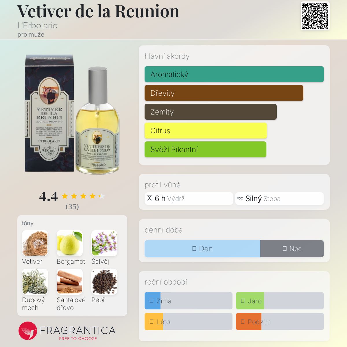 Vetiver de la Reunion podle L'Erbolario je Woody Aromatic vůně pro muže. Vrchní tóny jsou Bergamot, Černý pepř, Koriandr a Petitgrain; střední tóny jsouŠalvěj, Kosatec, Brambořík a Skořice ; základní tóny jsou Vetiver, Mech a Santalové dřevo.