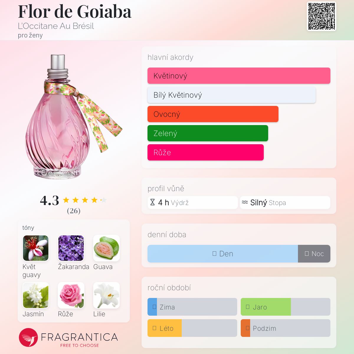Flor de Goiaba podle L’Occitane Au Brésil je Floral vůně pro ženy. Flor de Goiaba byl/a uveden/a v roce 2015. Vrchní tóny jsou Guava, Květ guavy a Žakaranda; střední tóny jsouJasmín, Růže, Lilie a Zelené tóny ; základní tóny jsou Vanilka a Pižmo.