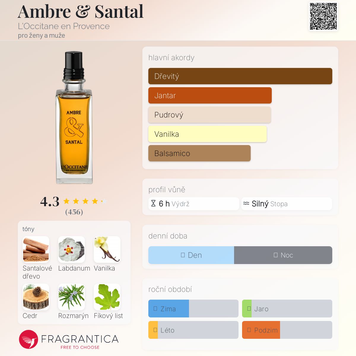 Ambre & Santal podle L'Occitane en Provence je Orientální Fougere vůně pro ženy a muže. Ambre & Santal byl/a uveden/a v roce 2013. "Nosem" za touto vůní je Karine Dubreuil-Sereni. Vrchní tóny jsou Rozmarýn a Bergamot; střední tóny jsouFíkový list a Růže ; základní tóny jsou Santalové dřevo, Labdanum, Vanilka a Cedr.