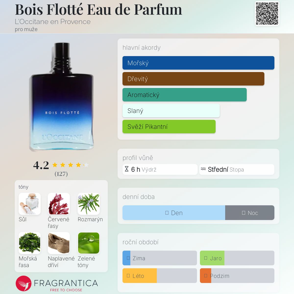 Bois Flotté Eau de Parfum podle L'Occitane en Provence je Aromatic Aquatic vůně pro muže. Bois Flotté Eau de Parfum byl/a uveden/a v roce 2021. Vrchní tóny jsou Červené řasy, Rozmarýn, Mořská tráva a Zelené listí; střední tóny jsouMořská sůl, Naplavené dříví a Muškátový oříšek ; základní tóny jsou Vetiver, Cedr a Mech.
