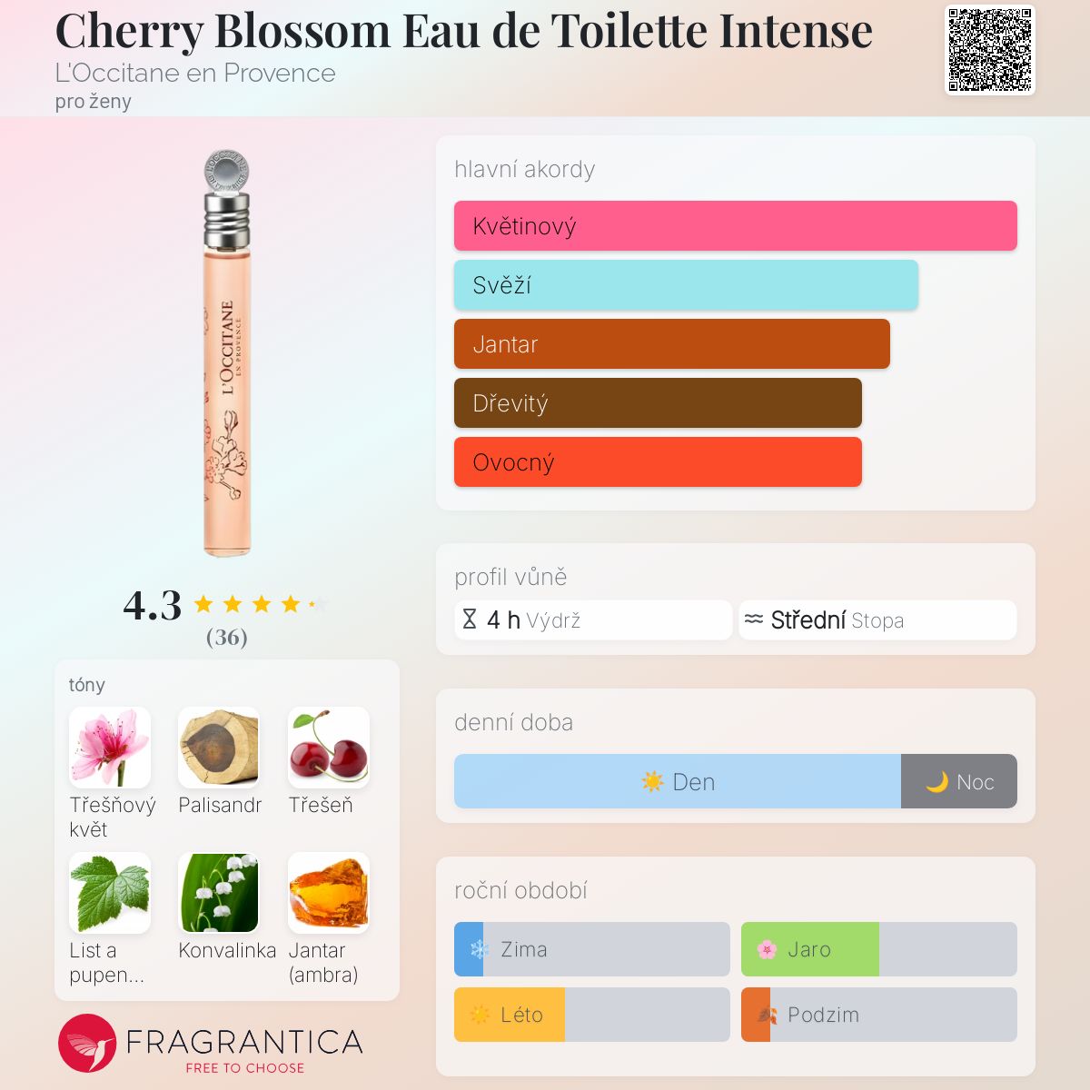 Cherry Blossom Eau de Toilette Intense podle L'Occitane en Provence je Floral vůně pro ženy. Cherry Blossom Eau de Toilette Intense byl/a uveden/a v roce 2016. Vrchní tóny jsou Třešeň, Černý rybíz a Frézie; střední tóny jsouTřešňový květ a Konvalinka ; základní tóny jsou Palisandr, Jantar (ambra) a Pižmo.