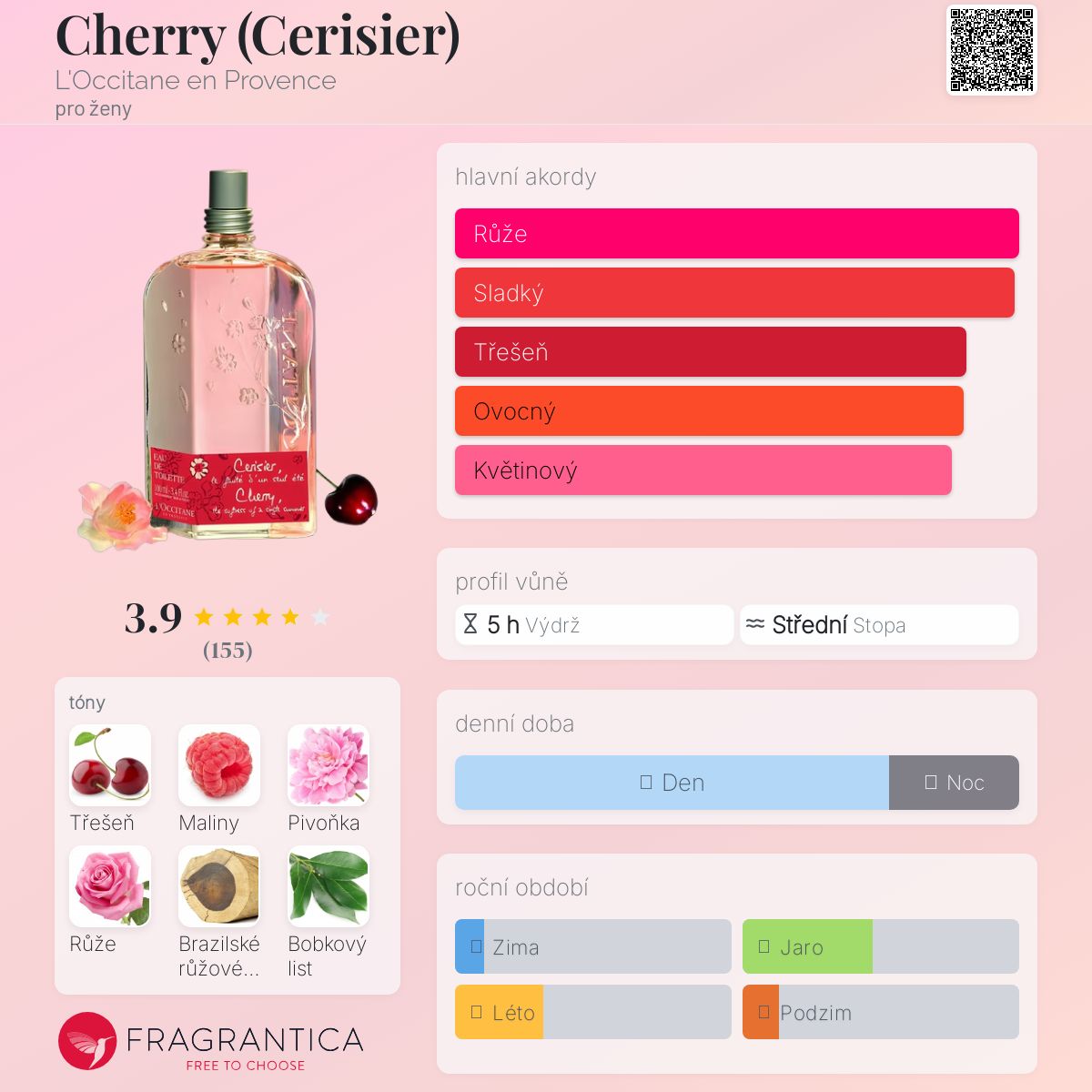 Cherry (Cerisier) podle L'Occitane en Provence je Floral Fruity vůně pro ženy. Cherry (Cerisier) byl/a uveden/a v roce 2008. Vrchní tóny jsou Maliny, Růže a Bobkový list; střední tóny jsouTřešeň a Pivoňka ; základní tóny jsou Třešňový extrakt a Brazilské růžové dřevo.
