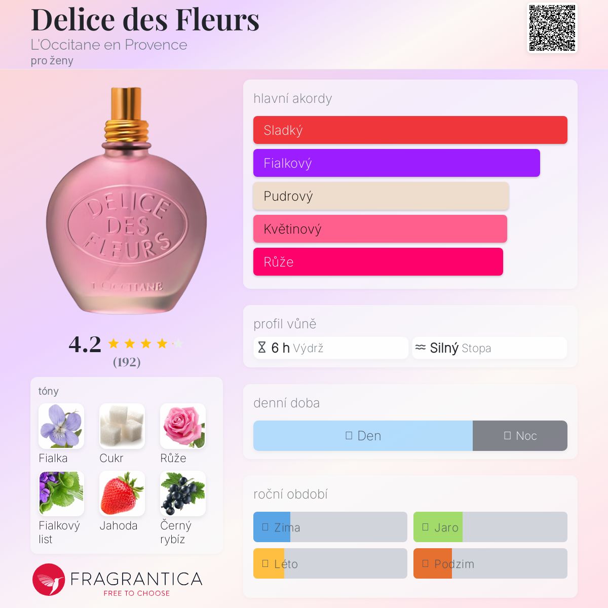 Delice des Fleurs podle L'Occitane en Provence je Floral vůně pro ženy. Delice des Fleurs byl/a uveden/a v roce 2011. Vrchní tóny jsou Cukr, Velká jahoda, Černý rybíz a Mandarinka; střední tóny jsouFialka, Květná růže, Fialkový list a Šeřík ; základní tóny jsou Vanilka a Santalové dřevo.