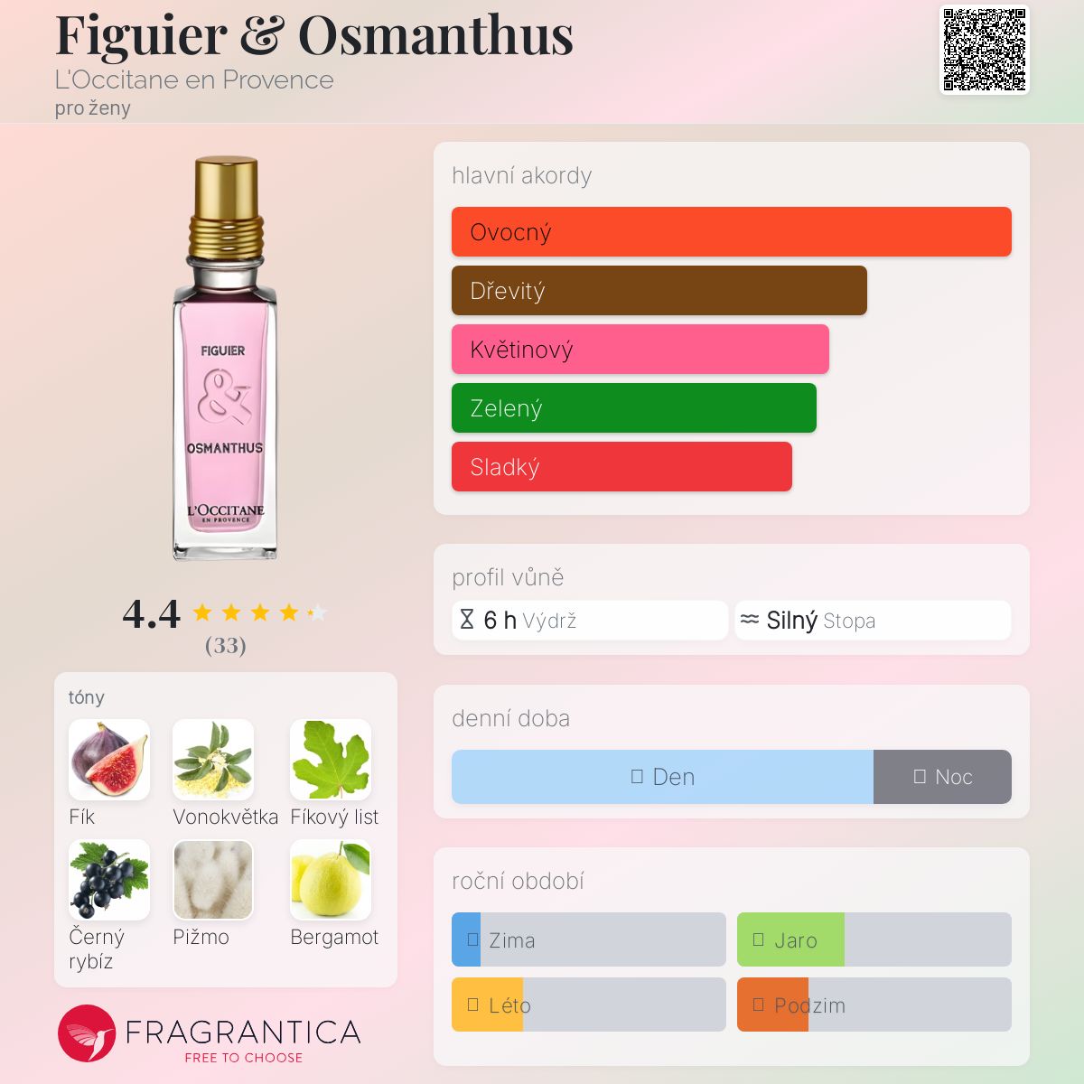 Figuier & Osmanthus podle L'Occitane en Provence je Floral Fruity vůně pro ženy. Figuier & Osmanthus byl/a uveden/a v roce 2015. "Nosem" za touto vůní je Karine Dubreuil-Sereni. Vrchní tóny jsou Fík, Černý rybíz a Bergamot; střední tóny jsouVonokvětka a Fíkový list ; základní tóny jsou Pižmo a Cedr.