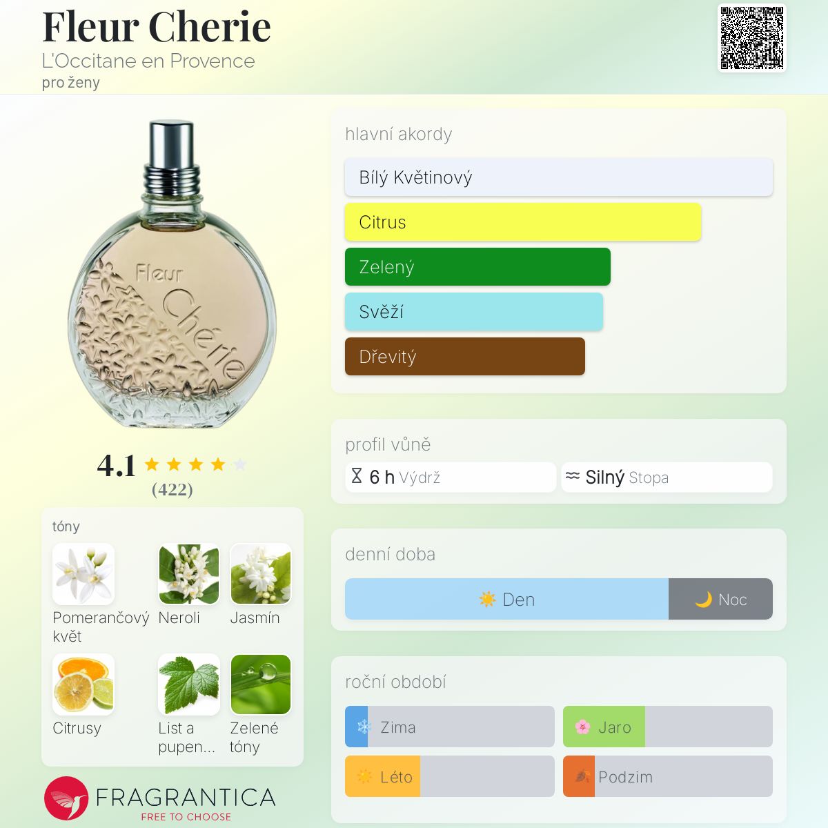 Fleur Cherie podle L'Occitane en Provence je Floral vůně pro ženy. Fleur Cherie byl/a uveden/a v roce 2010. Vrchní tóny jsou Neroli, Citrusy, Černý rybíz a Zelené tóny; střední tóny jsouKvět afrického pomeranče a Jasmín ; základní tóny jsou Pižmo, Pačuli a Virginský cedr.