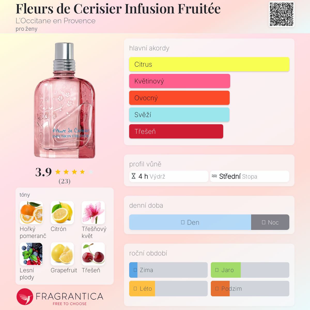 Fleurs de Cerisier Infusion Fruitée podle L'Occitane en Provence je Floral Fruity vůně pro ženy. Fleurs de Cerisier Infusion Fruitée byl/a uveden/a v roce 2021. Vrchní tóny jsou Hořký pomeranč, Citrón a Grapefruit; střední tóny jsouTřešňový květ, Třešeň, Gardénie a Jasmín ; základní tóny jsou Lesní plody, Kosatec a Pižmo.