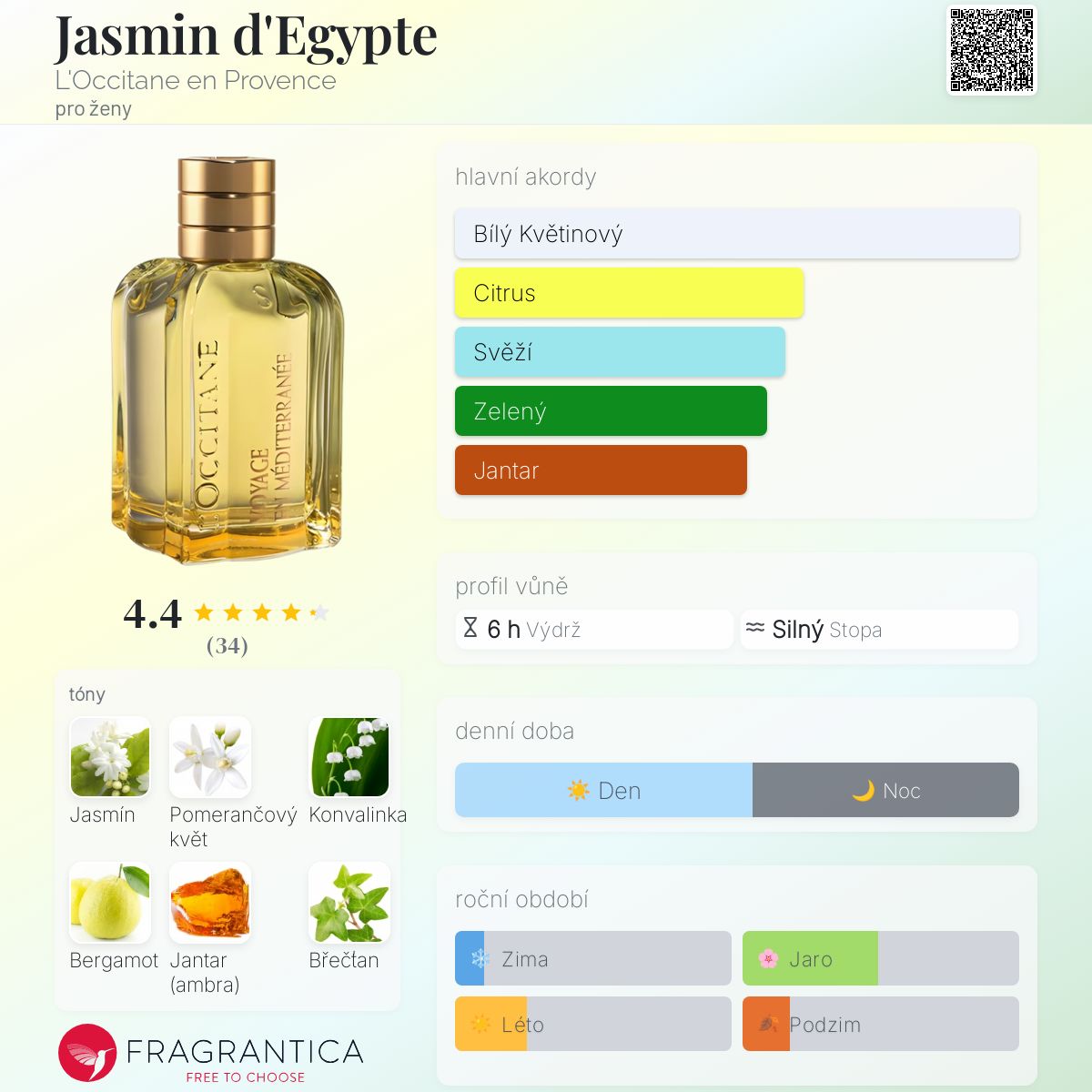 Jasmin d'Egypte podle L'Occitane en Provence je Floral vůně pro ženy. Jasmin d'Egypte byl/a uveden/a v roce 2008. Vrchní tóny jsou Bergamot a Břečťan; střední tóny jsouEgyptský jasmín, Pomerančový květ a Konvalinka ; základní tóny jsou Jantar (ambra) a Cedr.