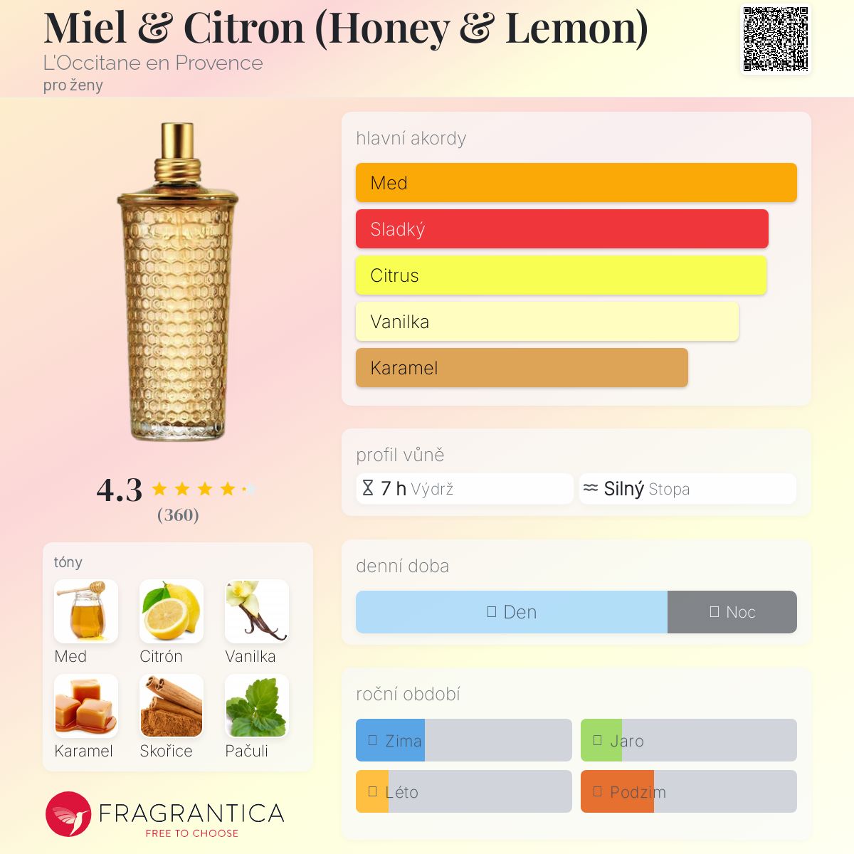 Miel & Citron (Honey & Lemon) podle L'Occitane en Provence je Citrus Gourmand vůně pro ženy. Miel & Citron (Honey & Lemon) byl/a uveden/a v roce 2007. Vrchní tóny jsou Citrón a Skořice; střední tóny jsouMed a Karamel ; základní tóny jsou Vanilka a Pačuli.