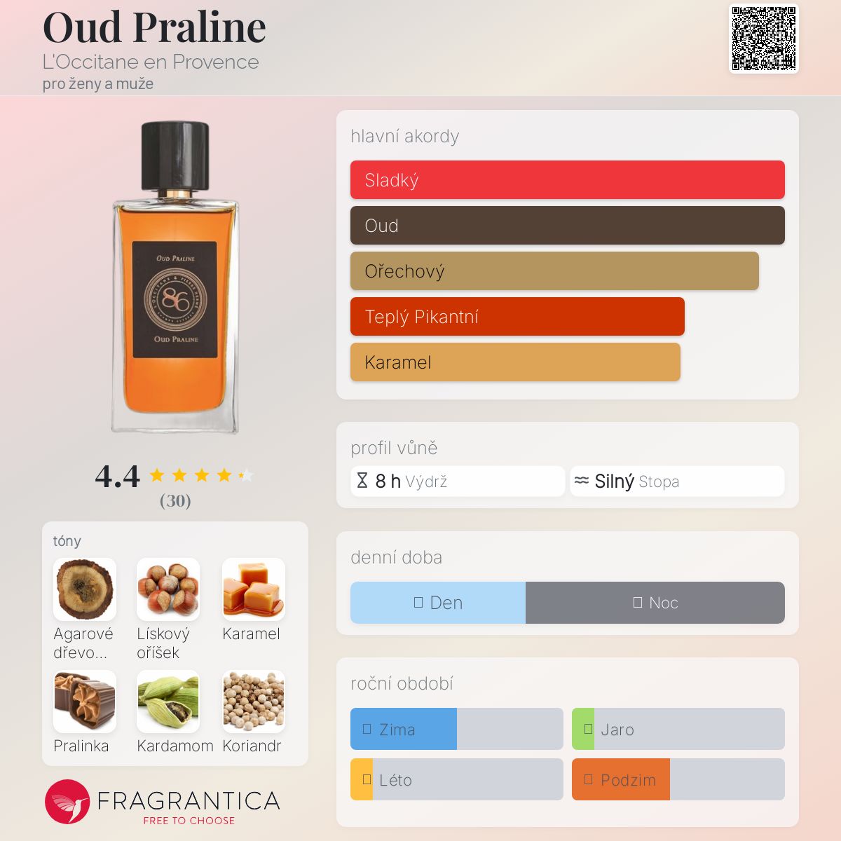 Oud Praline podle L'Occitane en Provence je Orientální Vanilla vůně pro ženy a muže. Oud Praline byl/a uveden/a v roce 2020. Vrchní tóny jsou Kardamom, Koriandr a Zázvor; střední tóny jsouLískový oříšek, Karamel a Pralinka ; základní tón je Agarové dřevo (oud).