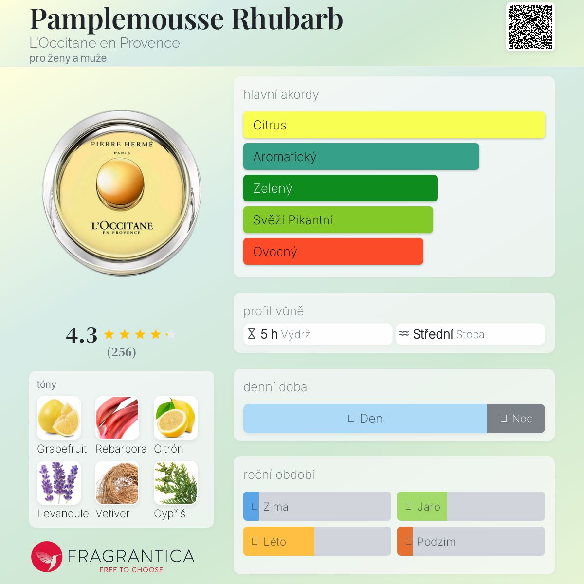 Pamplemousse Rhubarb podle L'Occitane en Provence je Aromatic vůně pro ženy a muže. Pamplemousse Rhubarb byl/a uveden/a v roce 2015. Vrchní tóny jsou Grapefruit, Rebarbora, Citrón a Cypřiš; střední tóny jsouLevandule, Muškátový oříšek a Hřebíček ; základní tóny jsou Vetiver a Cedr.