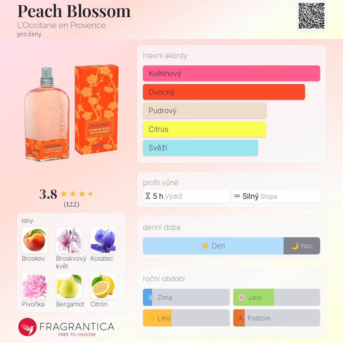 Peach Blossom podle L'Occitane en Provence je Floral Fruity vůně pro ženy. Peach Blossom byl/a uveden/a v roce 2009. Vrchní tóny jsou Broskev, Bergamot a Citron amalfi; střední tóny jsouBroskvový květ, Pivoňka a Mandle ; základní tóny jsou Kosatec, Fazole tonka, Pižmo a Virginský cedr.