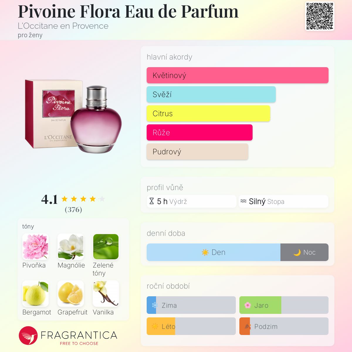 Pivoine Flora Eau de Parfum podle L'Occitane en Provence je Floral vůně pro ženy. Pivoine Flora Eau de Parfum byl/a uveden/a v roce 2011. Vrchní tóny jsou Zelené tóny, Bergamot a Grapefruit; střední tóny jsouPivoňka, Magnólie a Fialka ; základní tóny jsou Vanilka, Pižmo a Virginský cedr.