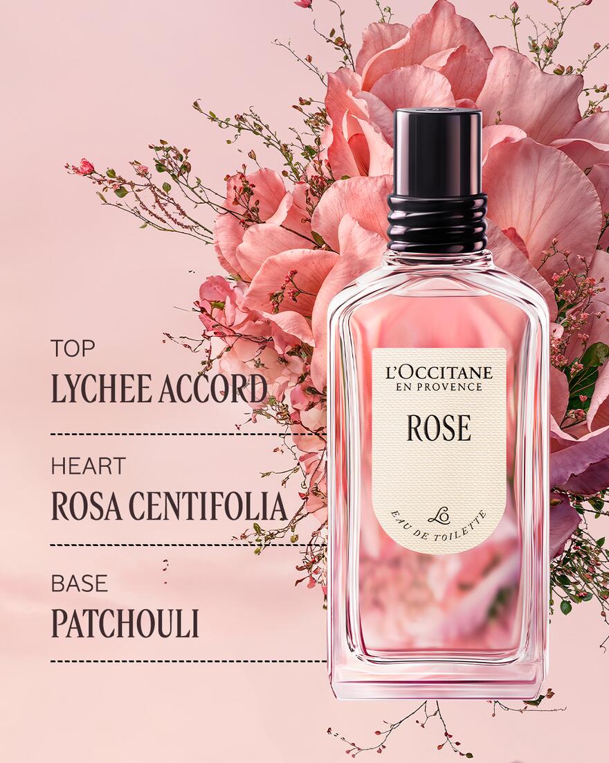 Rose Eau de Toilette podle L'Occitane en Provence je Chypre Floral vůně pro ženy. Toto je nová vůně. Rose Eau de Toilette byl/a uveden/a v roce 2025. Vrchní tón je Liči ; střední tón jeRůže májová ; základní tón je Pačuli.